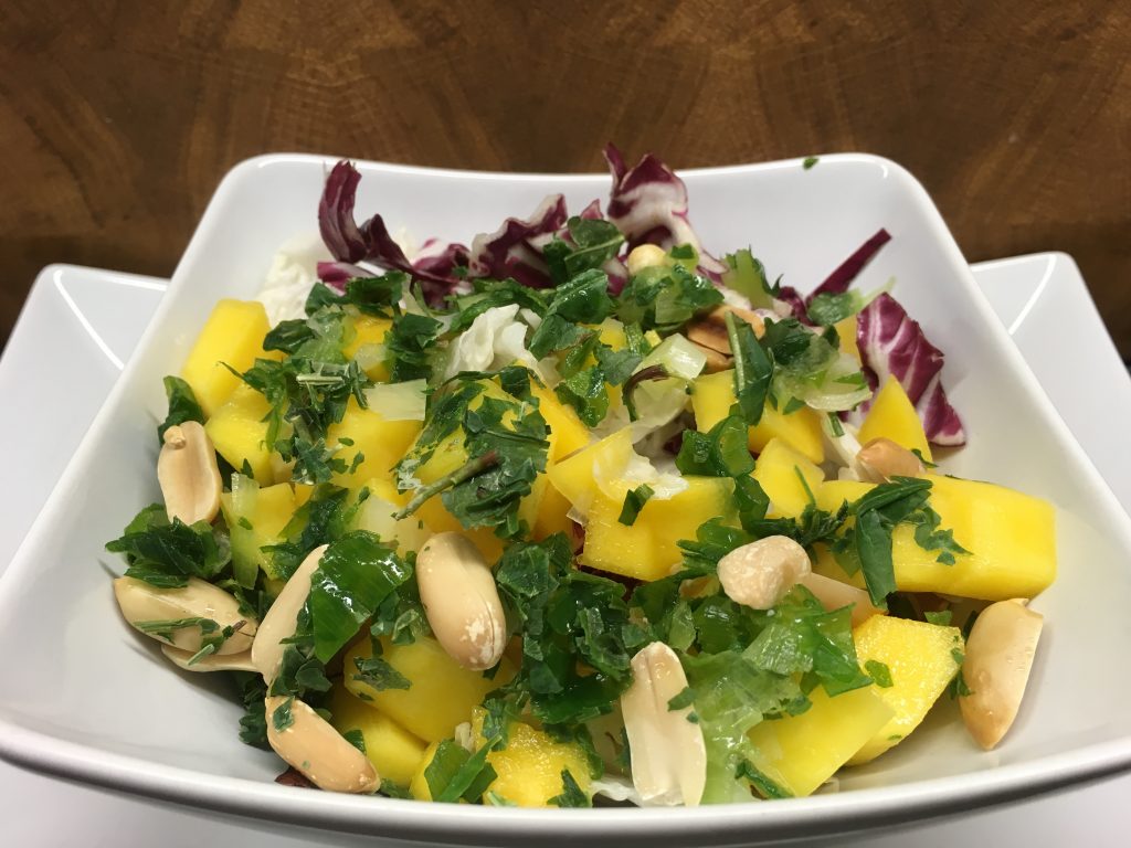 Chinakohl Radicchio Salat mit Mango und Erdnuss Orangen Curry Dressing