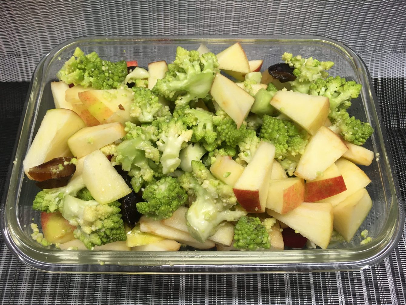 - Brokkoli zusammen mit den Äpfeln, den Datteln in einer Salatschüssel vermischen.