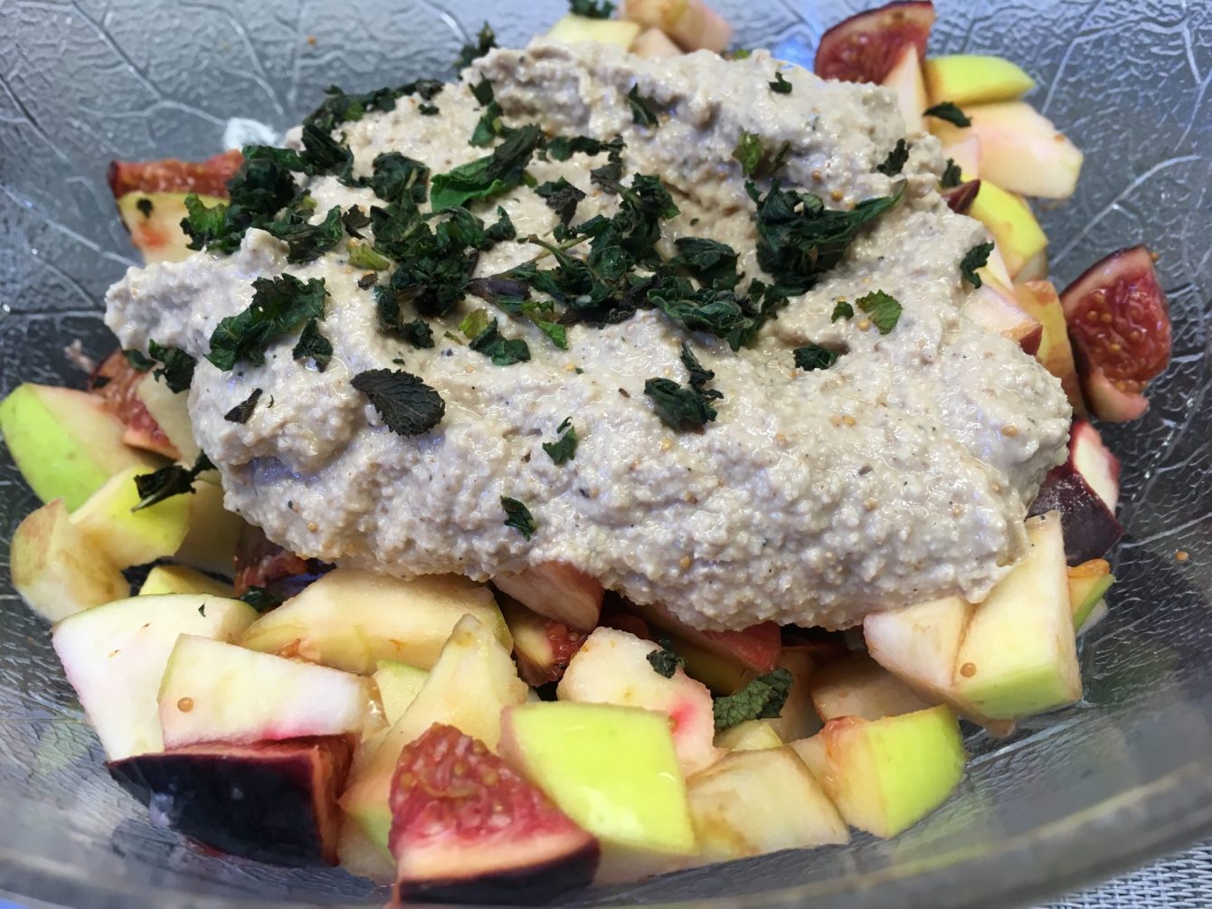Ein toller Frühstückssalat für den Herbst: Apfel Feigen Salat mit Walnuss-Feigen-Ingwer-Zimt-Creme und frischer Minze und Basilikum und gerösteten Walnüssen.