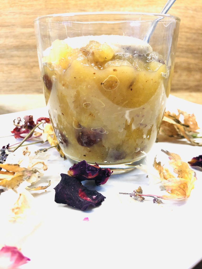 - Die Äpfel in einem kleinen Topf mit etwas Wasser und den Gewürzen zum köcheln bringen und weiter köcheln lassen, bis die Äpfel weich sind und auseinander fallen.