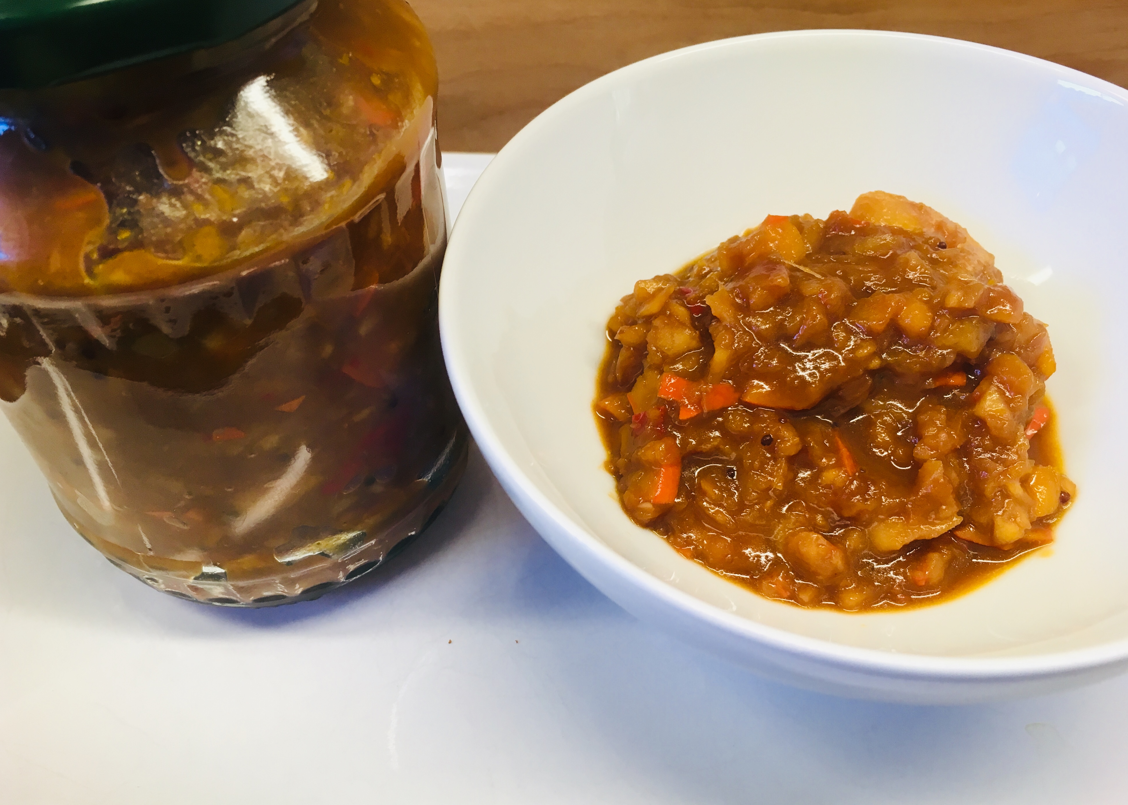 Das Apfel Kürbis Chutney besteht aus Kürbis, Äpfeln, Zwiebeln, Ingwer, Knoblauch, Chili und Gewürzen und wird nur gesüßt mit Dattelsirup.