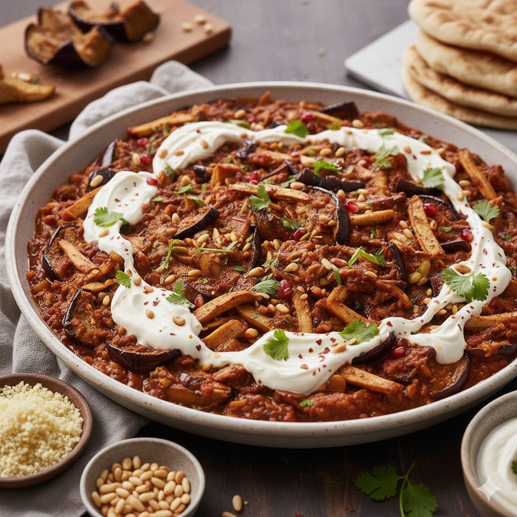 Die Inspiration für dieses Gericht liegt tief in der reichen Küche des Nahen Ostens. Dort werden Auberginen gerne in langen Kochprozessen geschmort, die ihre natürliche Süße und die samtige Textur hervorheben. Die Kombination mit herben Gewürzen wie Baharat, geräuchertem Paprika und Kreuzkümmel verleiht dem Gericht jene warme, verführerische Aromatik, die man in traditionellen Gemüse- oder Fleischeintöpfen findet. Mit Austernpilzen erhält das Rezept außerdem eine tolle, fleischige Komponente – perfekt für alle, die es deftig und sättigend mögen, ohne Fleisch zu essen.