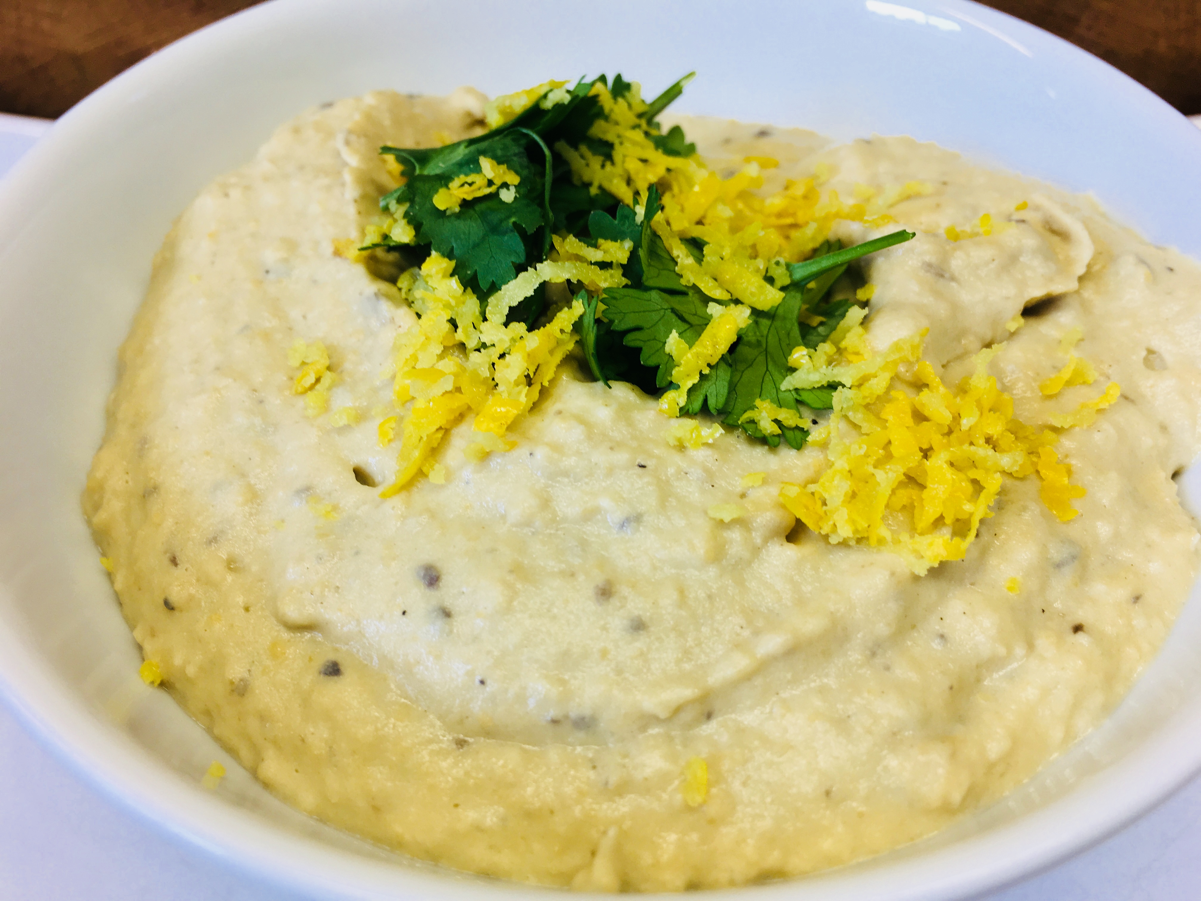 in diesem Rezept vereinen sich Kichererbsen mit Auberginen und Tahini, gewürzt mit Knoblauch, Zitrone, Olivenöl und Cumin.