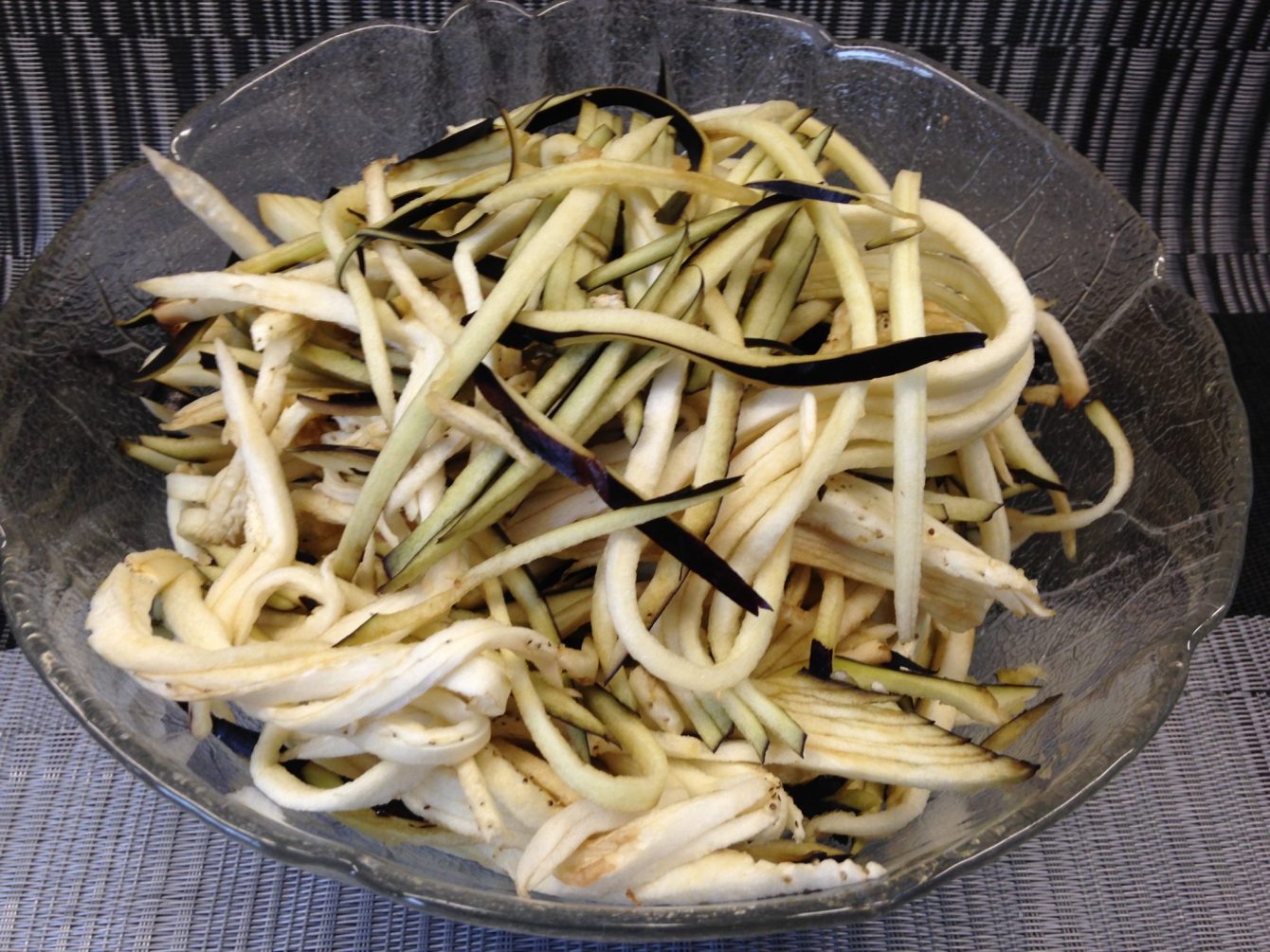 Gemüse Pasta oder Nudeln aus Gemüse habe ich schon einige gemacht, am häuigsten Zoodles aus Zucchini, aber auch Spaghetti aus Kohlrabi oder Rettich, Bandnudeln aus Süßkartoffeln oder Karotten. Die Auberginen Pasta war neu für mich.