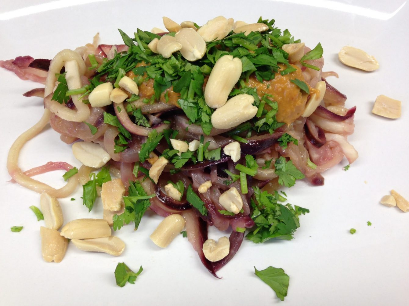 Die Auberginen Pasta mit Erdnuss Chili Sauce sind vegan und glutenfrei, denn die Nudeln bestehen aus Aubergine, gewürzt mit einer scharfen Erdnuss Sauce.