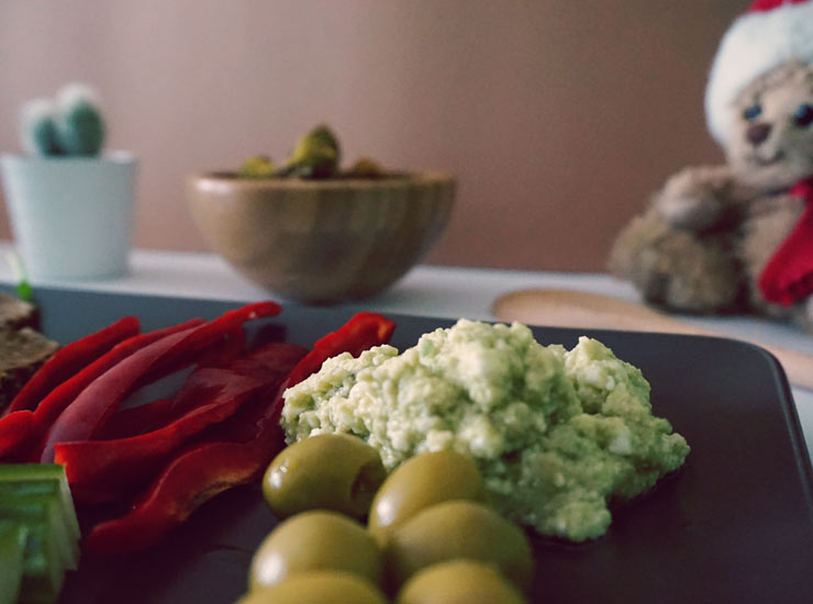 Simply cut avocado flesh off the stone and mash with a fork. Add feta cheese to it and mash it all together. Than add olive oil to it till you get smooth mixture. Add a bit of chilli and few chopped capers if you like. Serve it with your favourite bread and salad.