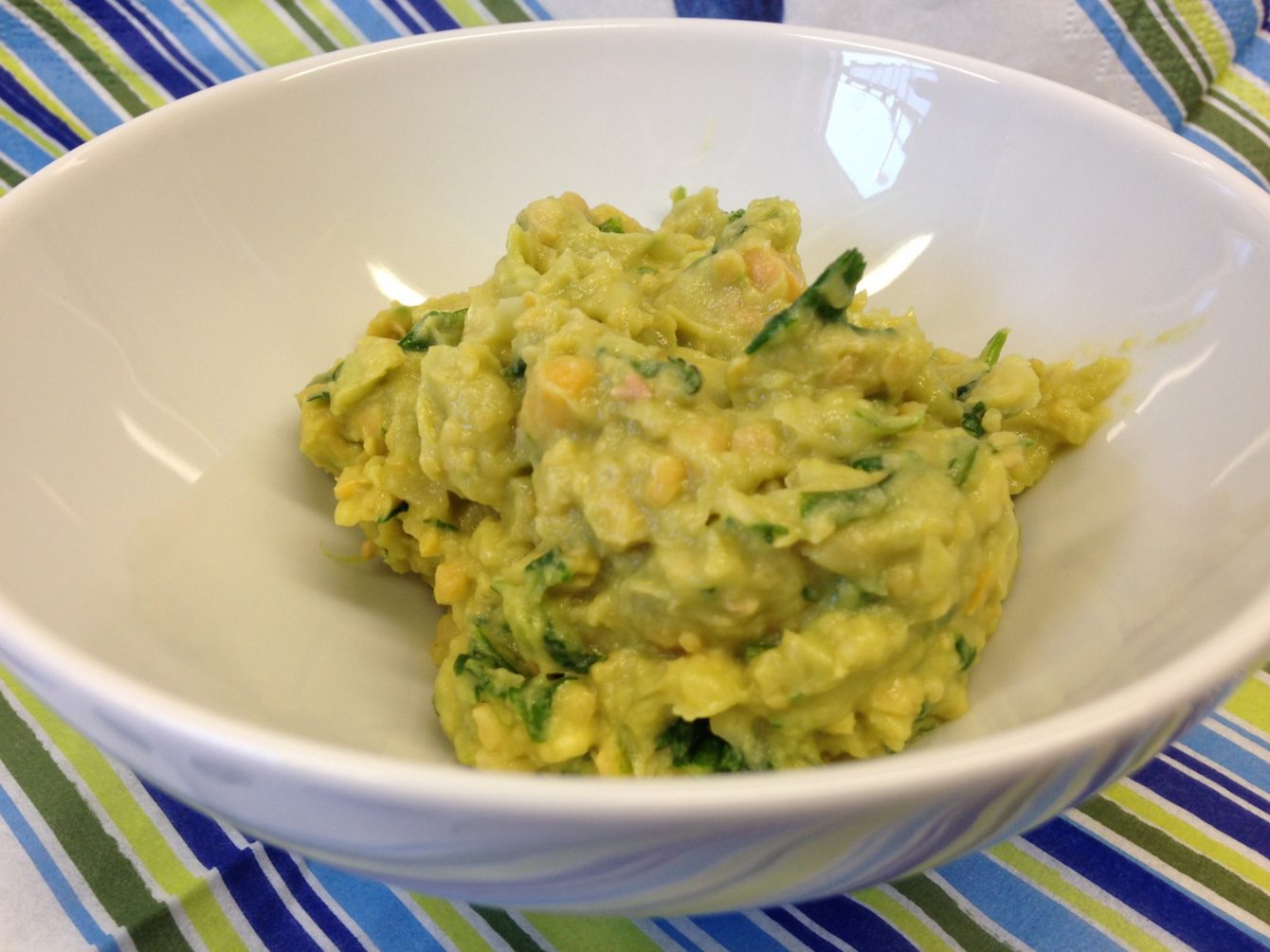 KIchererbsen und Koriander in einem Mixer oder Foodprozessor klein häckseln und mit Zitronensaft, Cayennepfeffer, Pfeffer und Salz würzen. Die Avocado dazugeben und alles zusammen zu einem Cremigen Dip verarbeiten. Ich habe die Paste nicht ganz fein vermisst, sondern noch etwas stückig gelassen.