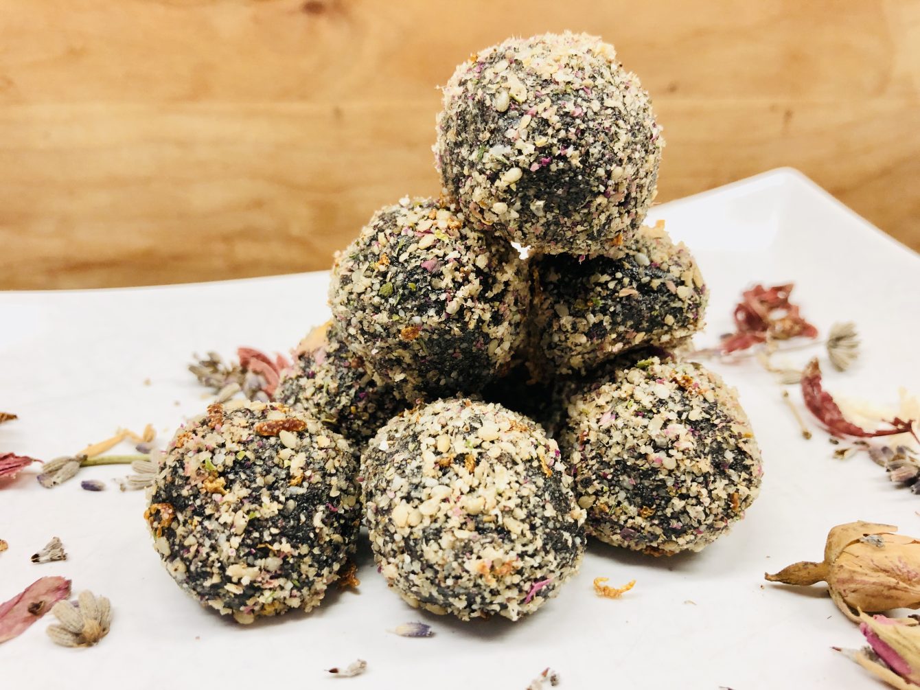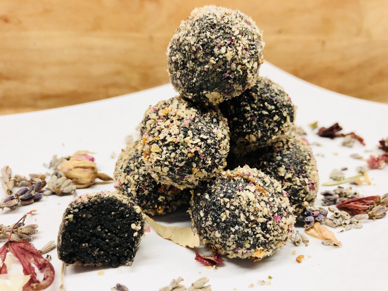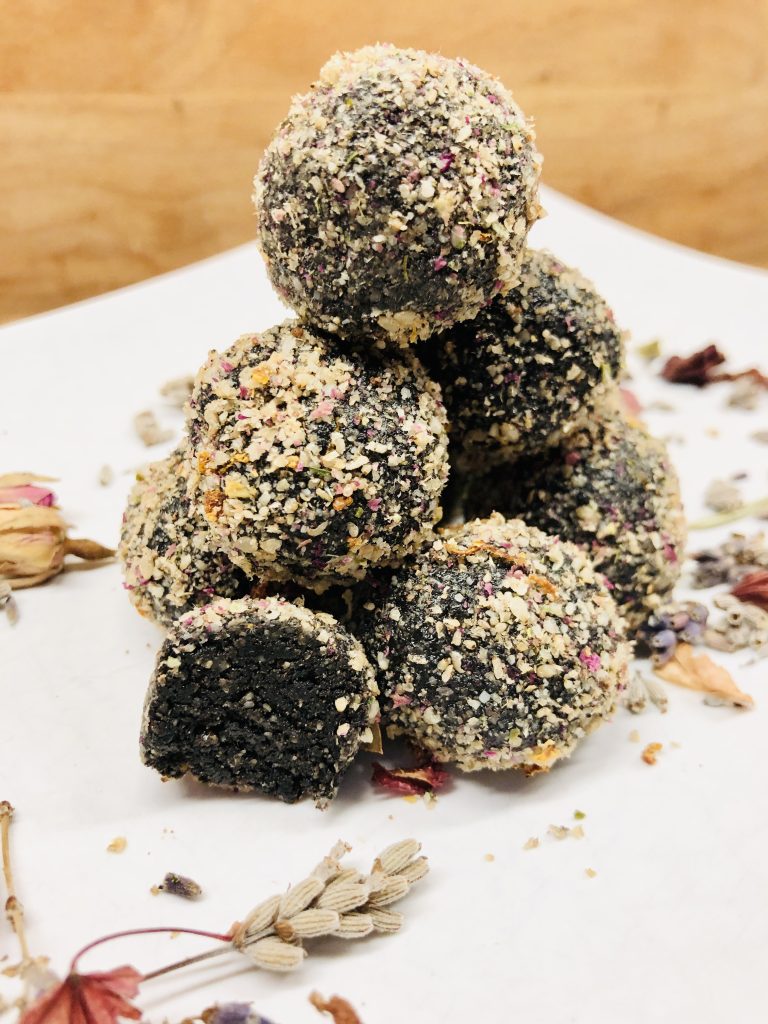 Das Rezept für die Ayurvedischen Energiebällchen mit schwarzem Sesam, Rosen, Orangen und Kardamom