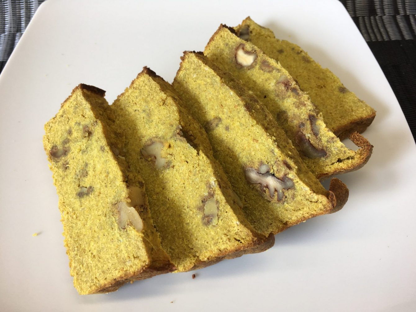 Die Inspiration zu diesem Rezept habe ich aus einem Banana Bread Rezept von One Green Planet, habe die Rezeptur allerdings etwas verändert und weitere Gewürze hinzugefügt. Meine Version erinnert eher an ein weihnachtliches Gewürzbrot, weil ich ziemlich viel Ingwer und noch Kardamom hinzugefügt habe. Aber ich liebe diese Gewürze und sie geben einen wunderbaren Kontrast zur Süße der Bananen und Feigen. Die schöne gelbe Farbe erhält das Brot durch Kurkuma, eines meiner Lieblingsgewürze, das ich fast überall verwende.