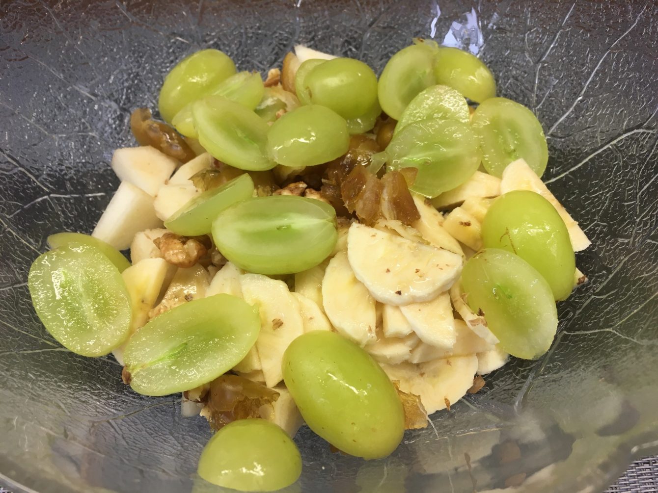 - Birne und die Hälfte der Bananen mit den Trauben und der Hälfte der Datteln und Walnüsse in einer Salatschüssel vermischen.