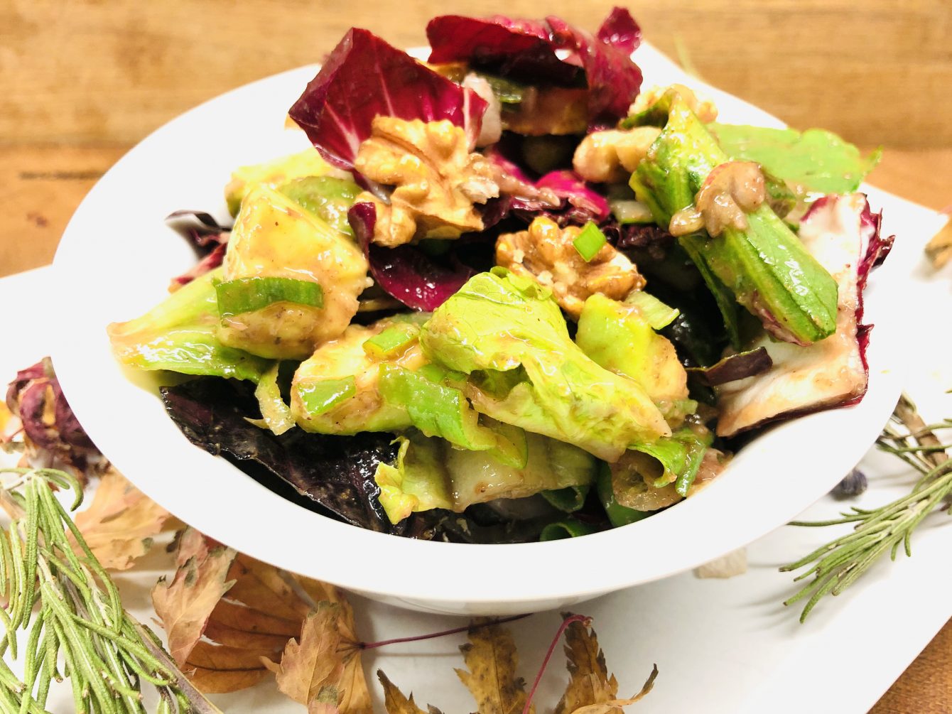 - Salat mit dem Dressing vermischen und mit den gerösteten Walnüssen und frischen Kräutern garniert servieren und genießen ?.