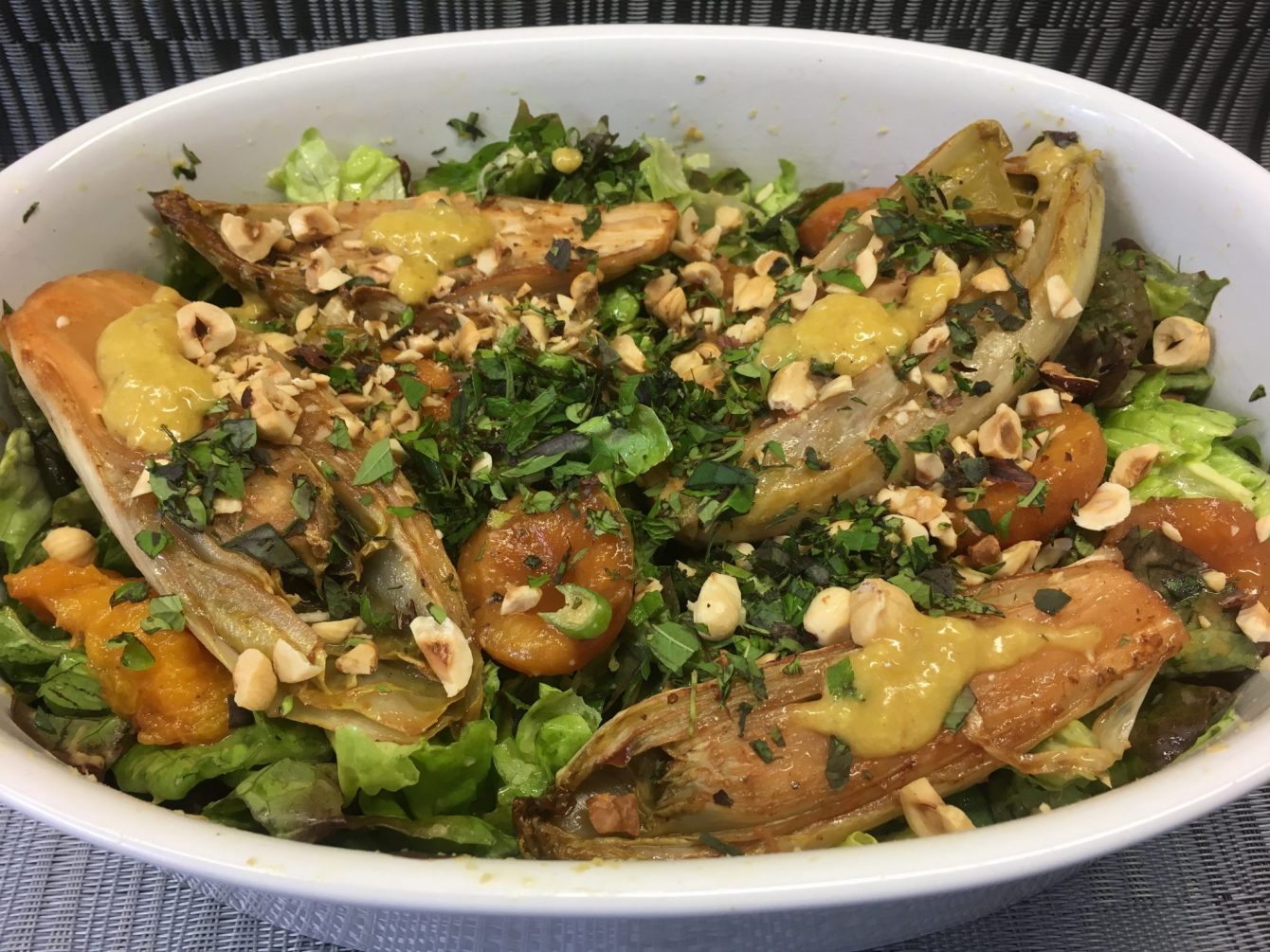 - Den Salat mit dem Dressing vermischen, dabei noch 1-2 EL für den gerösteten Chicorée und die Aprikosen aufbewahren.