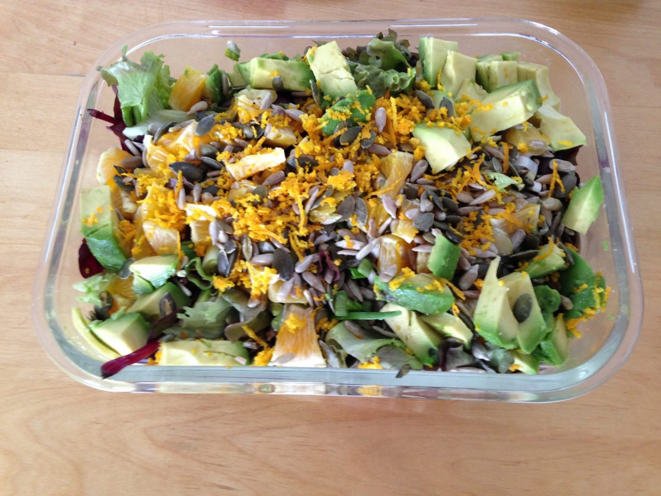 Blattsalat mit Orange, Avocado, Kürbiskernen und Oliven Vinaigrette