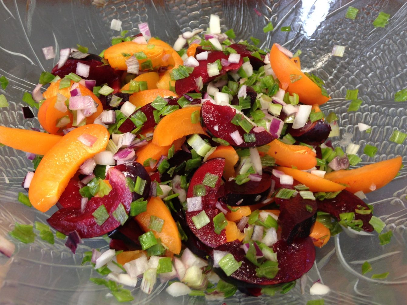 Ich hatte noch Pflaumen und Aprikosen, dazu Rettich und Kürbiskerne. Und dazu eine Vinaigrette aus Aprikosen. Das passt.