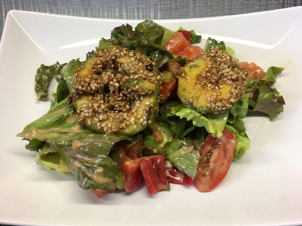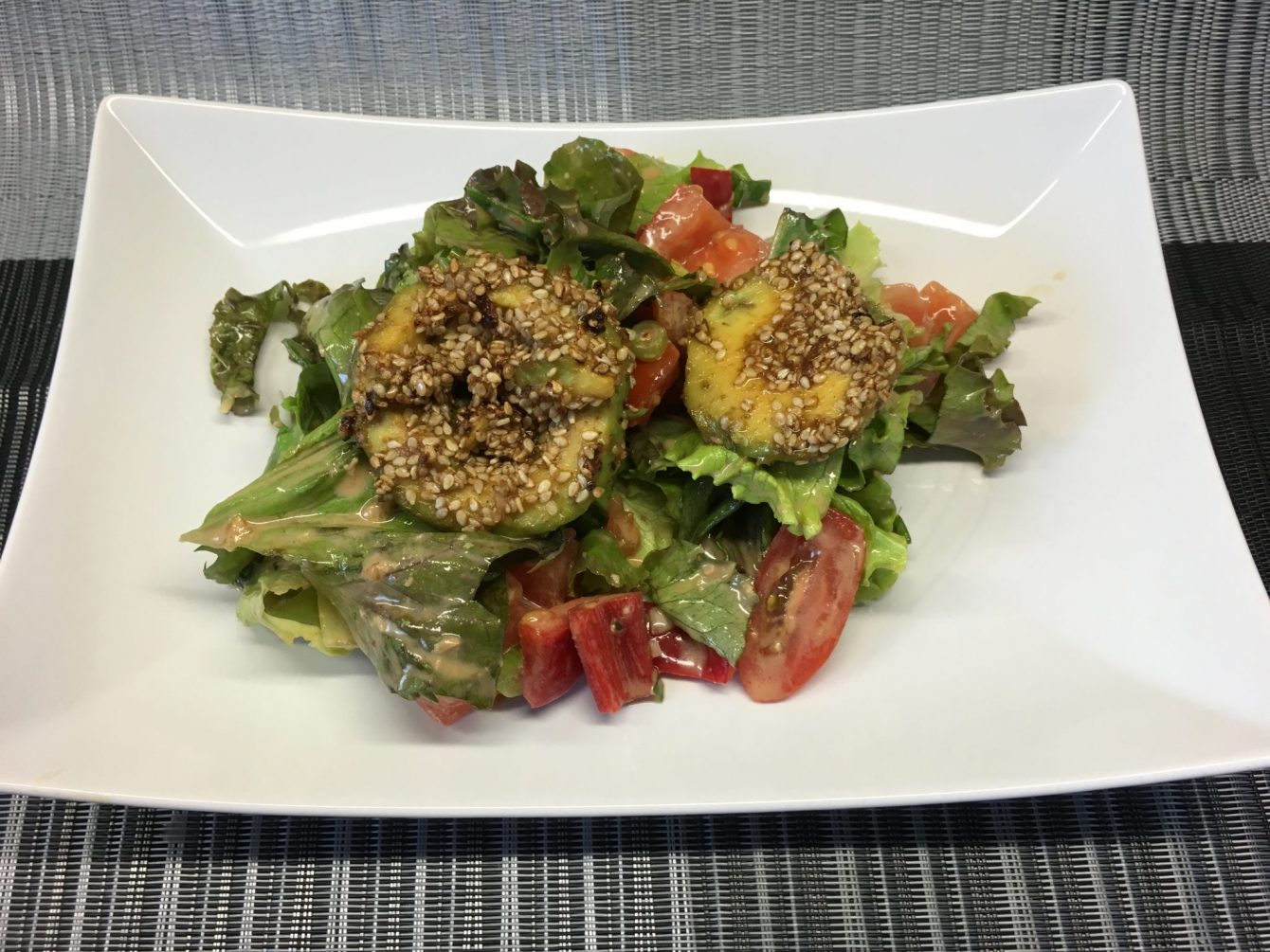 Der Salat mit Avocado und einem Ingwer Miso Tahini Dressing wird mit in einer Soja Mirin Marinade marinierter, gebratener Avocado mit knuspriger Sesamkruste serviert.