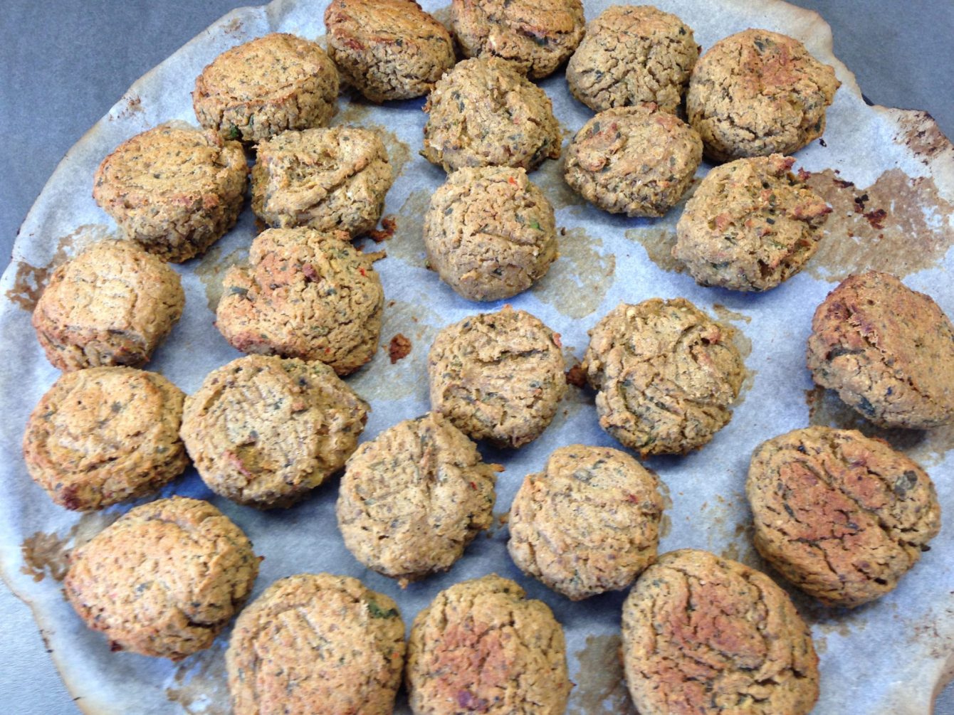 Aus dem Teig kleine Falafel Bällchen formen, auf ein mit Backpapier ausgelegtes Backblech legen und bei 180 Grad ca. 40-50 Minuten backen, dabei zwischendurch wenden.