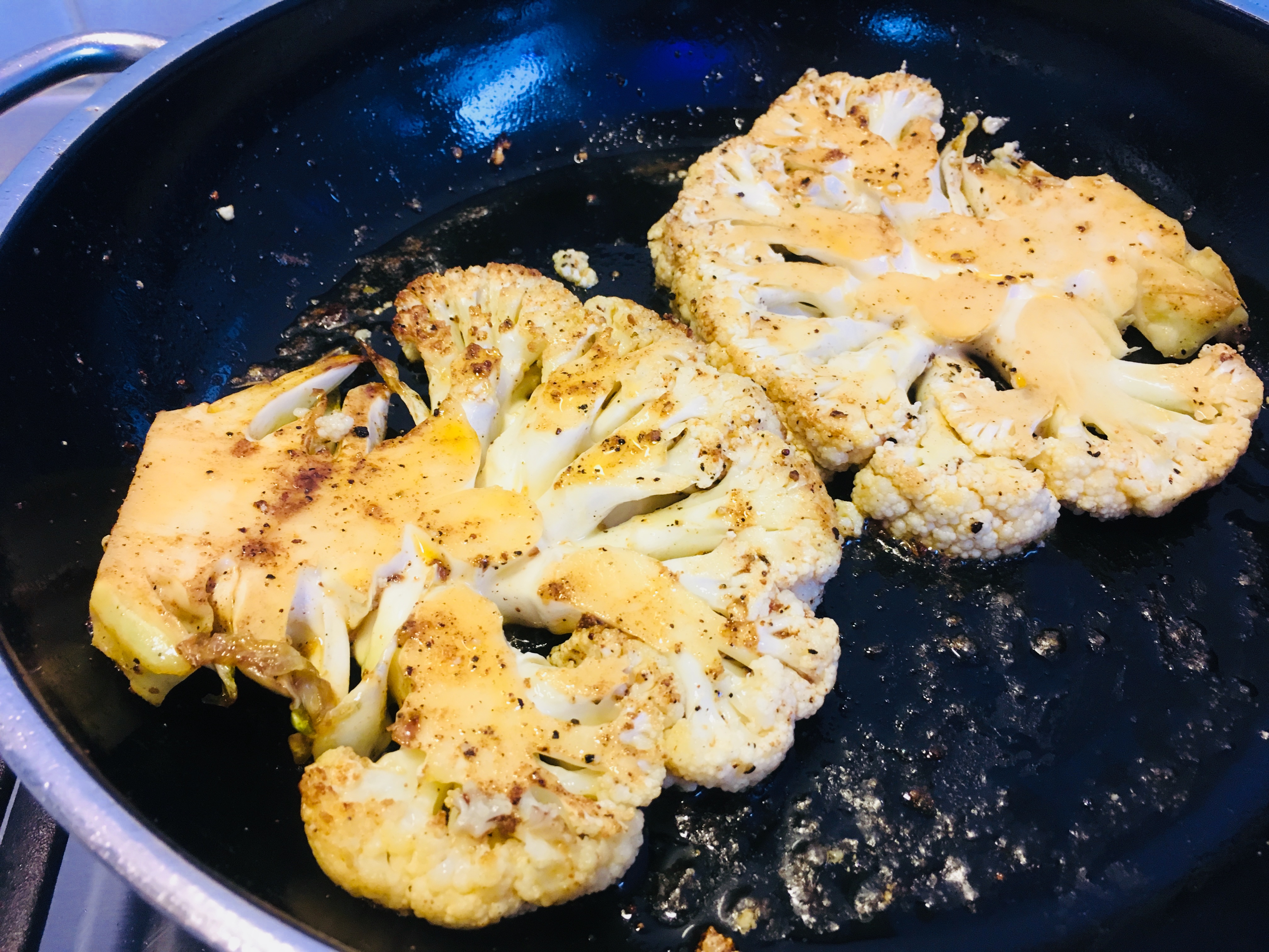 - Den Blumenkohl von den grünen Blättern befreien und in 3-4 cm dicke Scheiben schneiden. Die Blumenkohl Scheiben In einer Pfanne in etwas Olivenöl ein paar Minuten goldbraun braten. Und mit Salz und Pfeffer würzen.