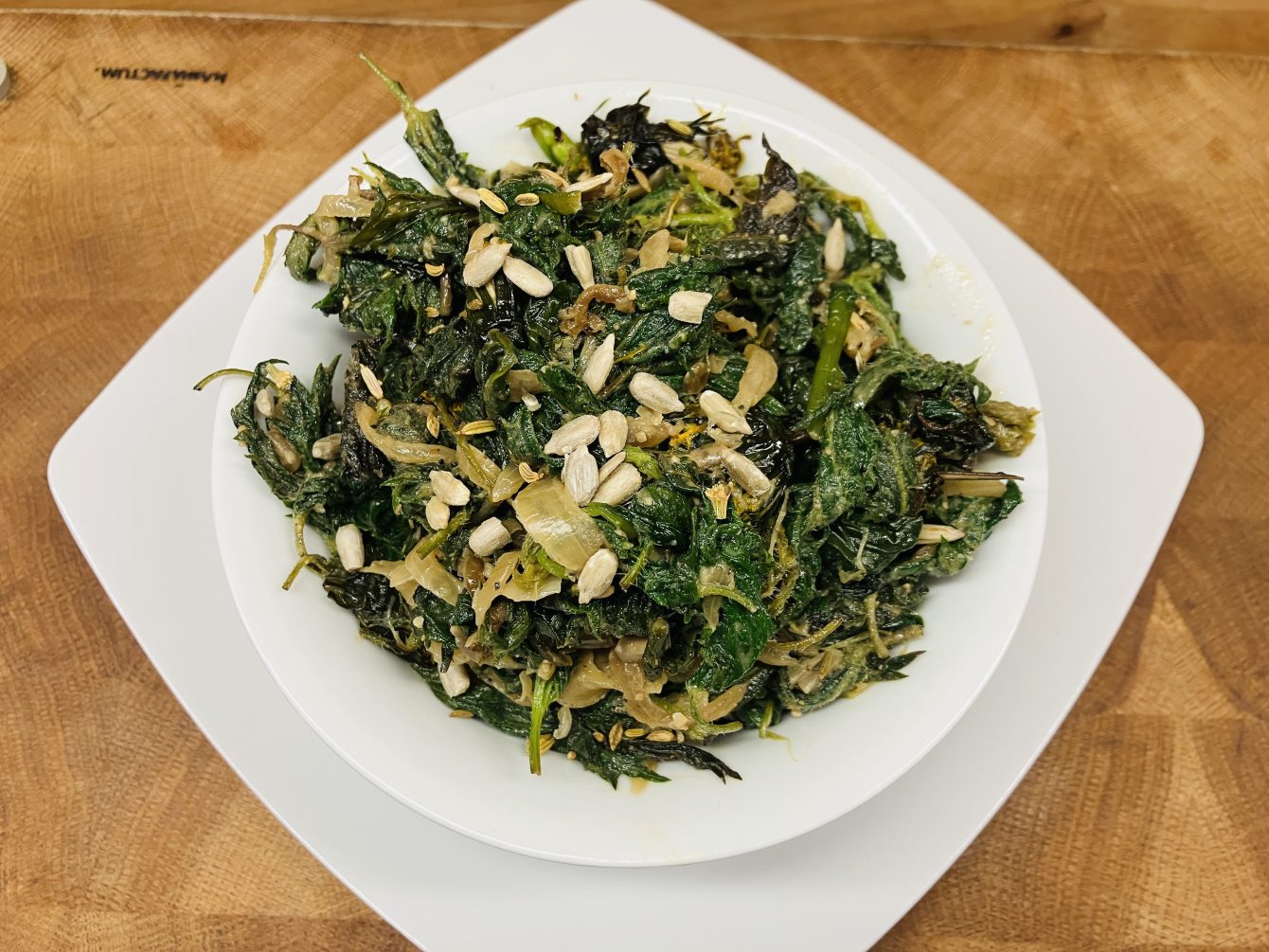 Rezept für 🌿 Brennnessel-Spinat mit Miso, Nussmus & Sonnenblumenkernen