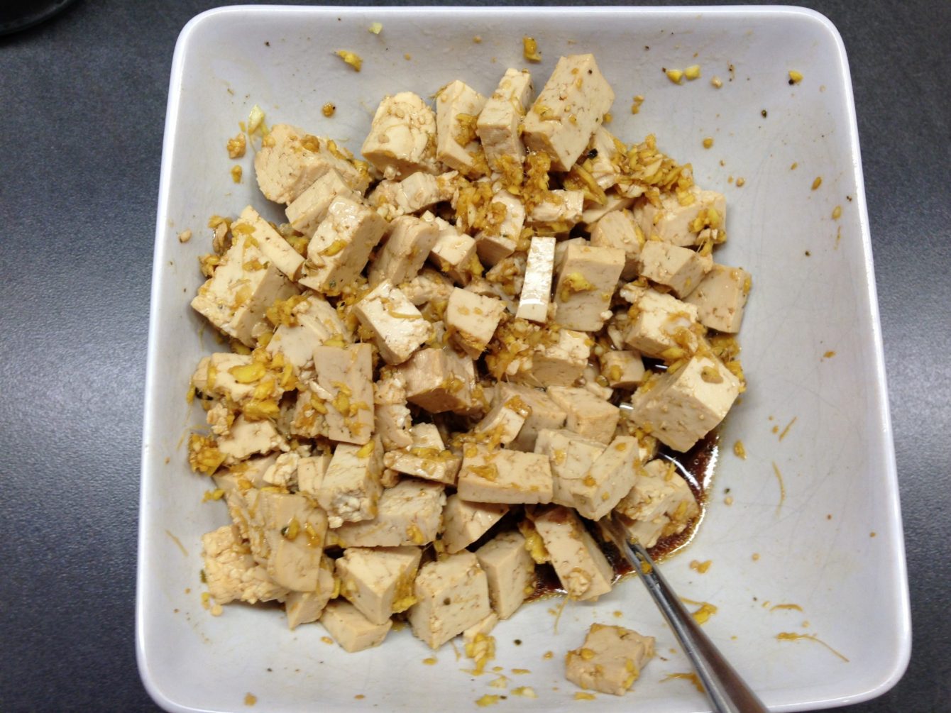 Ingwer und Knoblauch sehr fein hacken und zusammen mit dem Ahorn Sirup, Sesamöl, Soja Soße, Reisessig und Pfeffer zu einer Marinade verrühren und den Tofu darin min. 15 Minuten ziehen lassen, gerne auch länger.