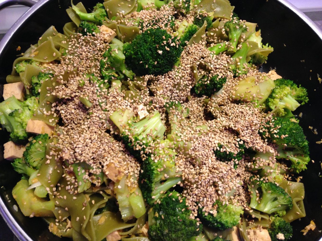 Brokkoli Tofu mit Spinatnudeln in Knoblauch Sesam Soße