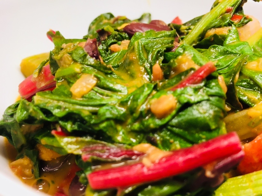 Das Mangold Gemüse aus buntem Mangold mit Kidney Bohnen, Paprika und Erdnüssen ist cremig, scharf und wärmend und asiatisch inspiriert. Schmeckt Solo als Gemüseeintopf oder auch als Beilage zu Reis oder Reisnudeln.