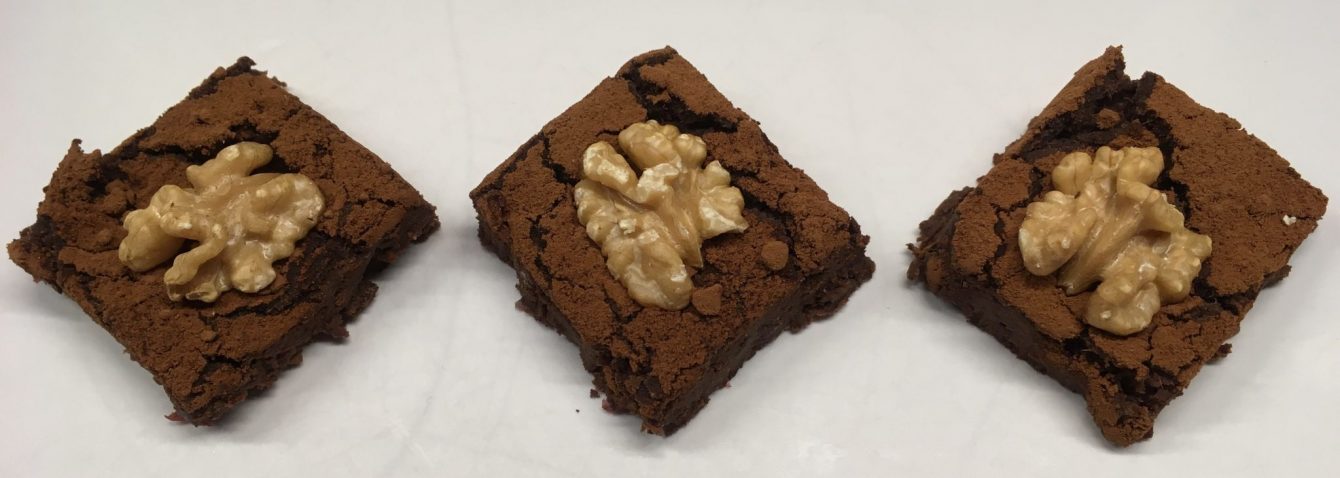 4. Für die Dekoration 1-2 EL Carobpulver mit einem Sieb über den Teig pudern und mit ganzen oder gehackten Nüssen verzieren.