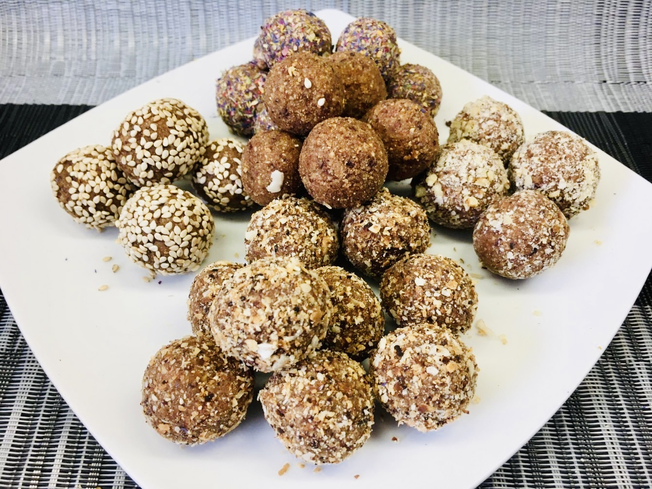 - Alle Zutaten in einem Mixer oder Foodprozessor zu einer homogenen Masse verarbeiten, zu Kugeln formen und nach Geschmack in Kokosraspeln, Sesamsamen oder Gewürzblüten wälzen.