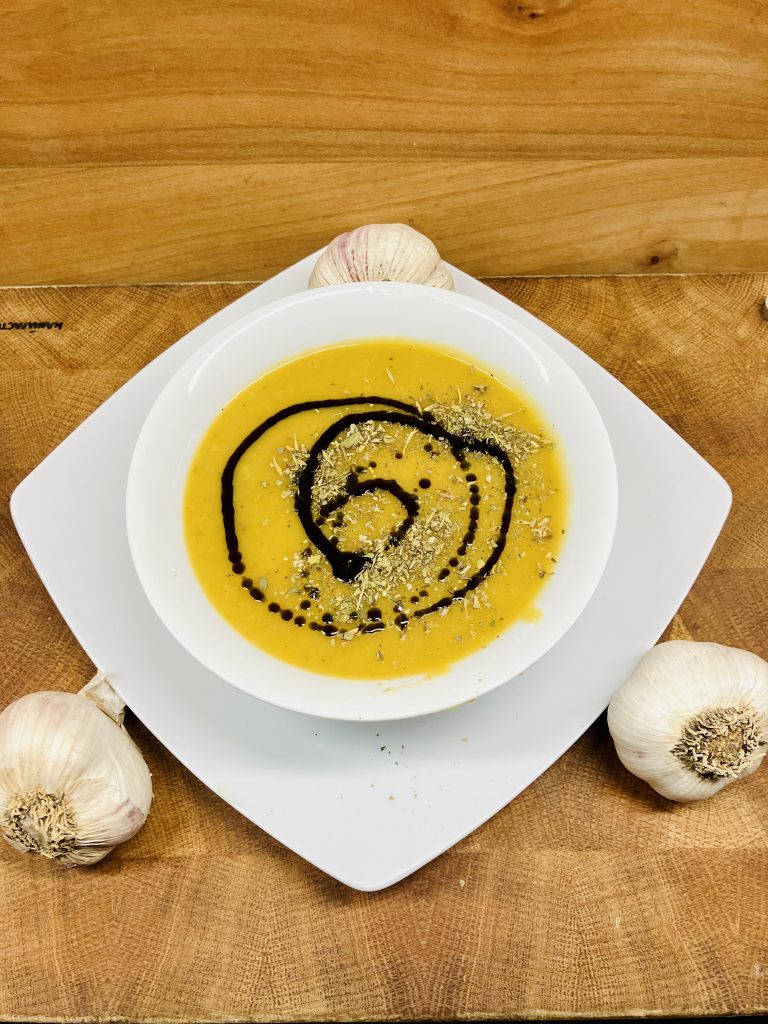 - Knoblauch: Durch das Rösten wird Knoblauch nicht nur milder, sondern bleibt auch gesund. Knoblauch enthält Verbindungen, die das Immunsystem stärken und entzündungshemmend wirken können. In höheren Mengen verleiht er der Suppe zudem einen einzigartigen Geschmack.