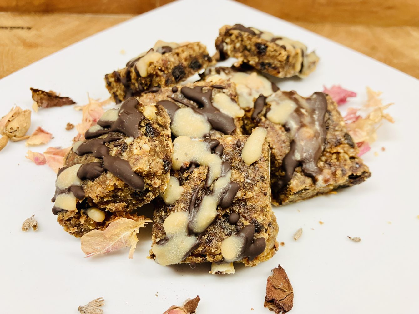 - Alles kombinieren: Die Trockenfruchtmasse zu den trockenen Zutaten geben und zusammen mit den restlichen Zutaten gut vermengen. Falls die Masse zu trocken ist, einen Spritzer Wasser oder Orangensaft hinzufügen.