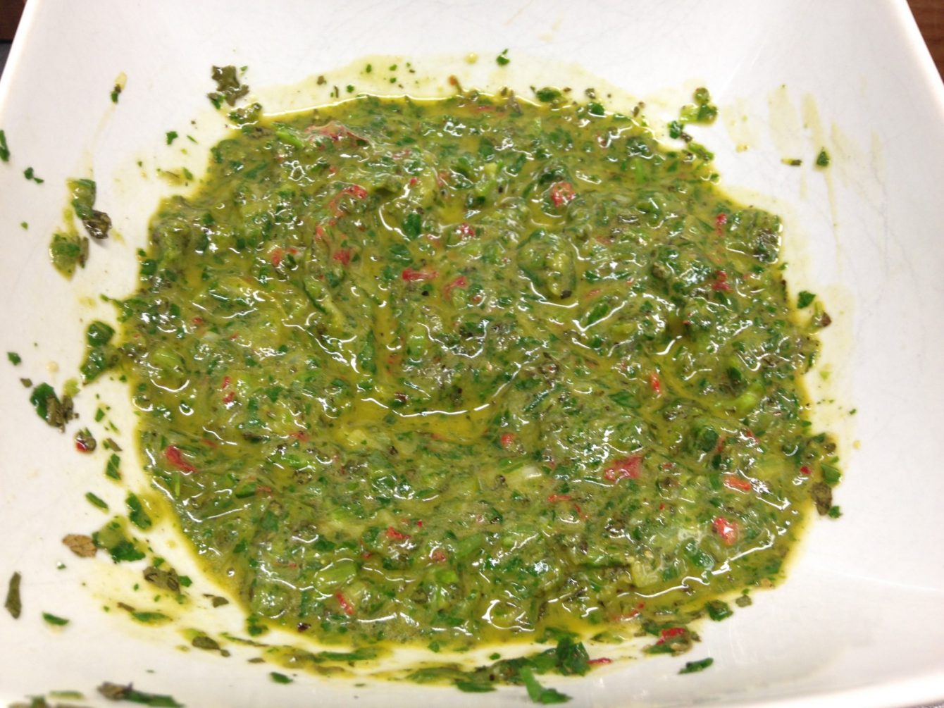 Das orientalische Pesto ist eine sehr aromatische Komposition aus herbem Koriander, süßer Dattel, scharfer Chilischote und fruchtiger Orangenschale. Am besten schmecken natürlich frische Reife Datteln, getrocknete gehen aber auch. in diesem Fall würde ich die Datteln in etwas Orangensaft einweichen. Arganöl oder Sesamöl geben dem Pesto eine nussige Komponente. Optional kann man auch Olivenöl und Mandeln oder Cashewkernen nehmen, aber am besten schmeckt es in der Original-Komposition.