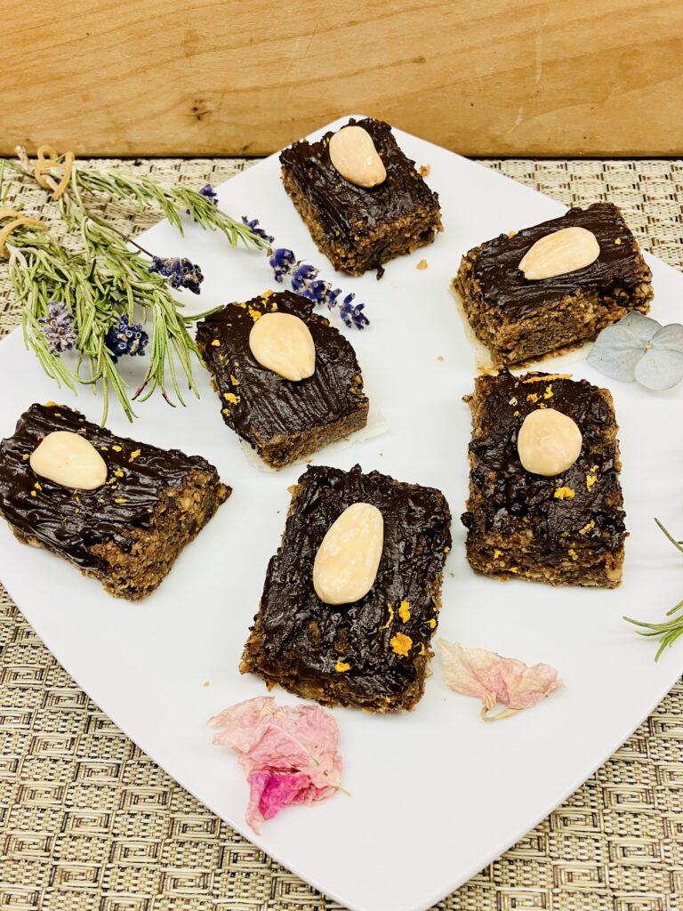 - Schneide die Lebkuchen in Quadrate, solange die Schokolade noch weich ist, und garniere mit gehackten Mandeln, Orangenzesten und nach Wunsch mit Goldstaub.