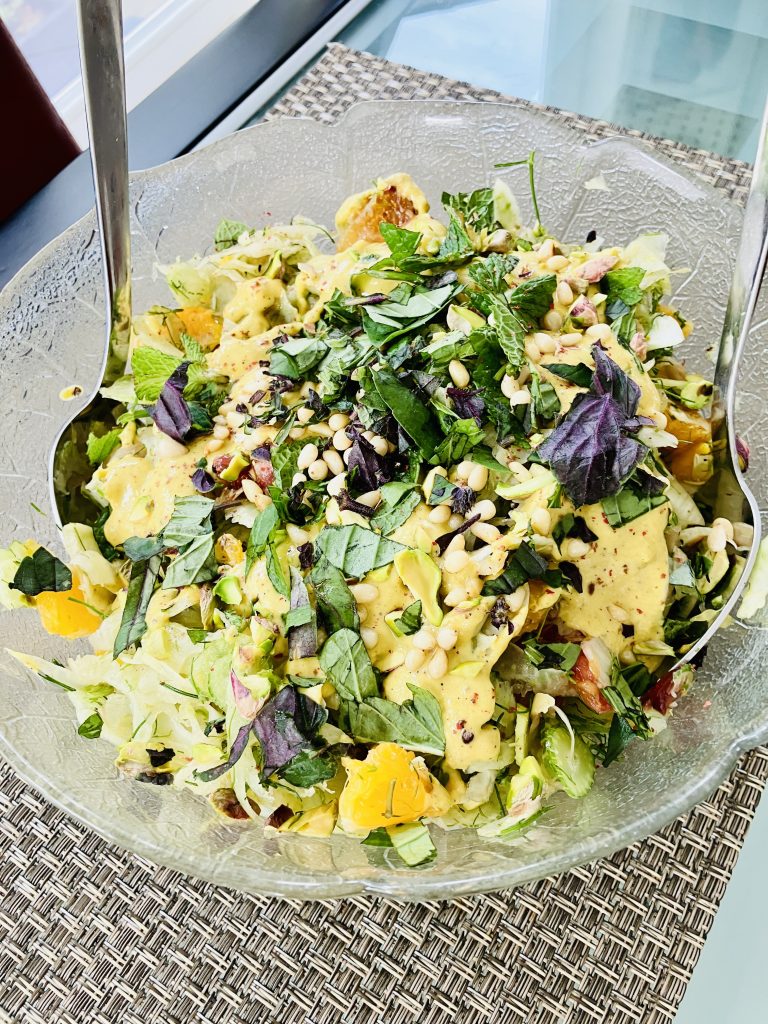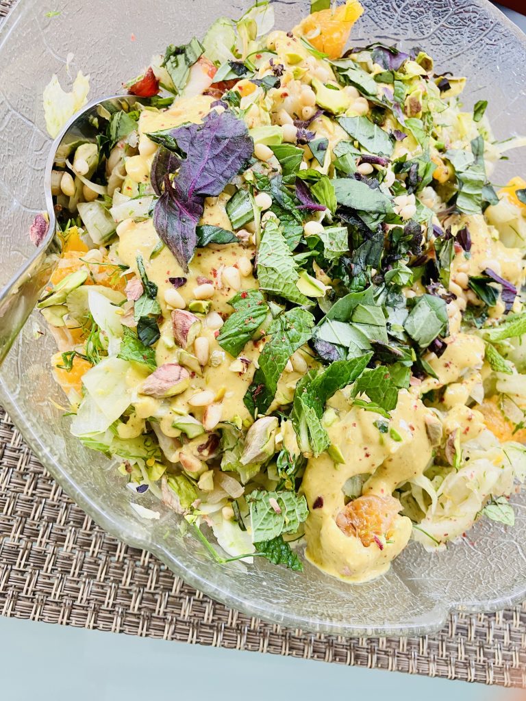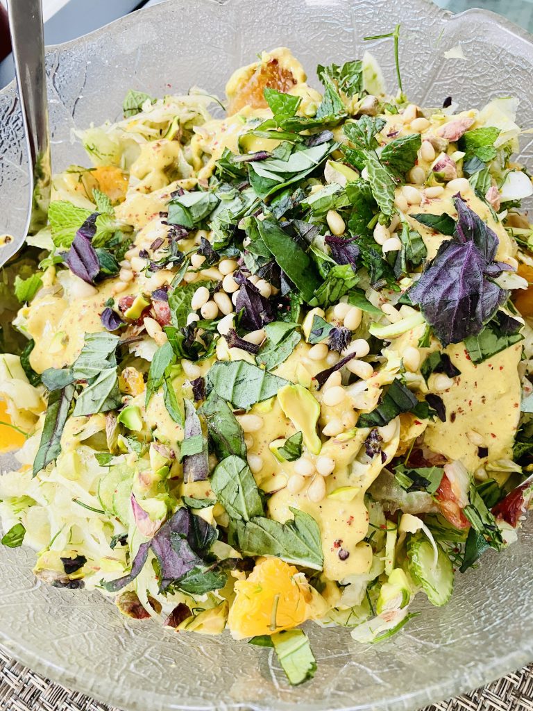 - Make the dressing: In a small bowl, whisk together the pistachio butter (or finely ground pistachios), orange juice, lemon juice, orange zest, vinegar, olive oil, and honey/agave. Season with salt and black pepper. If the dressing is too thick, thin it slightly with a spoonful of water or more orange juice.