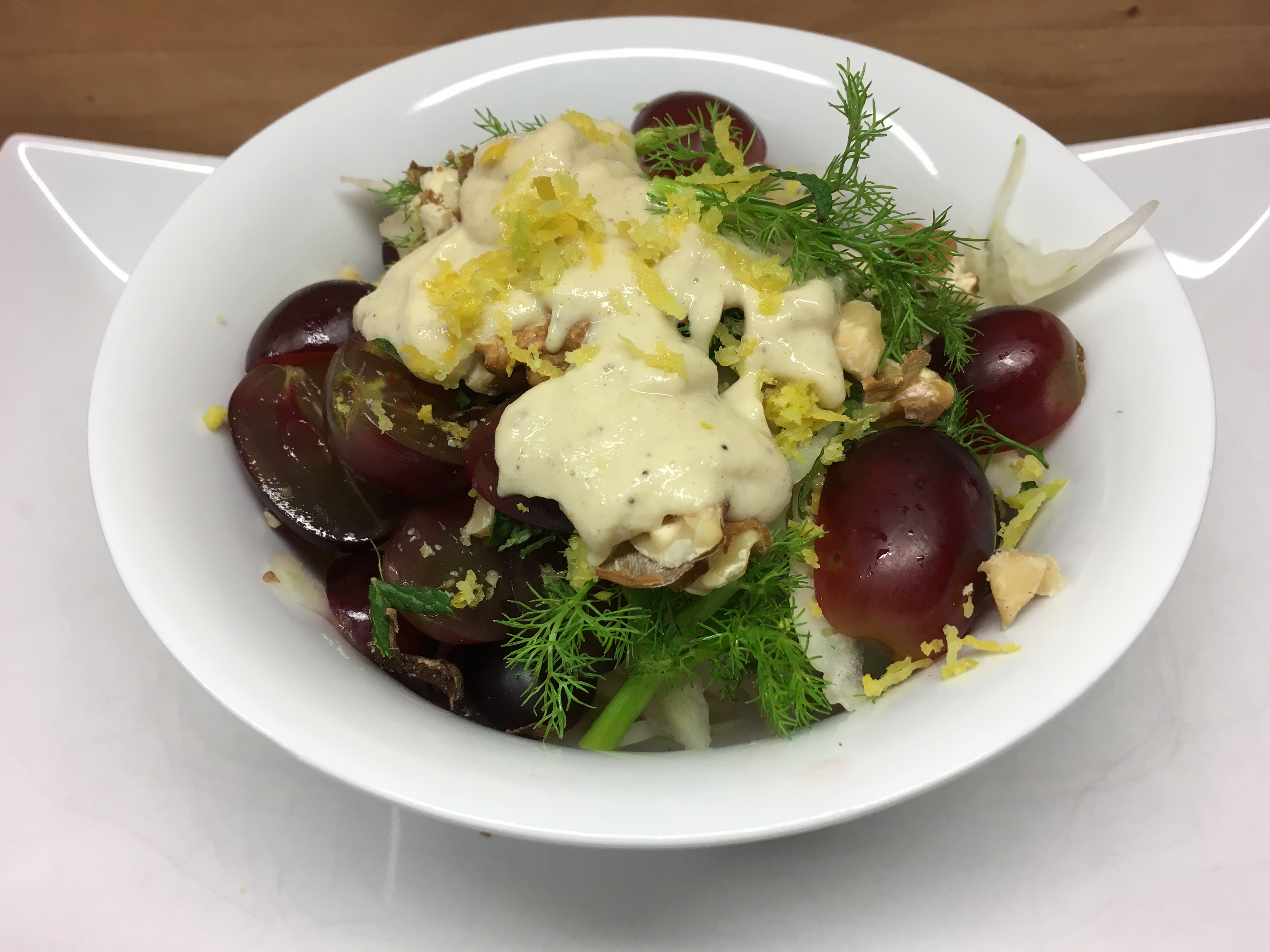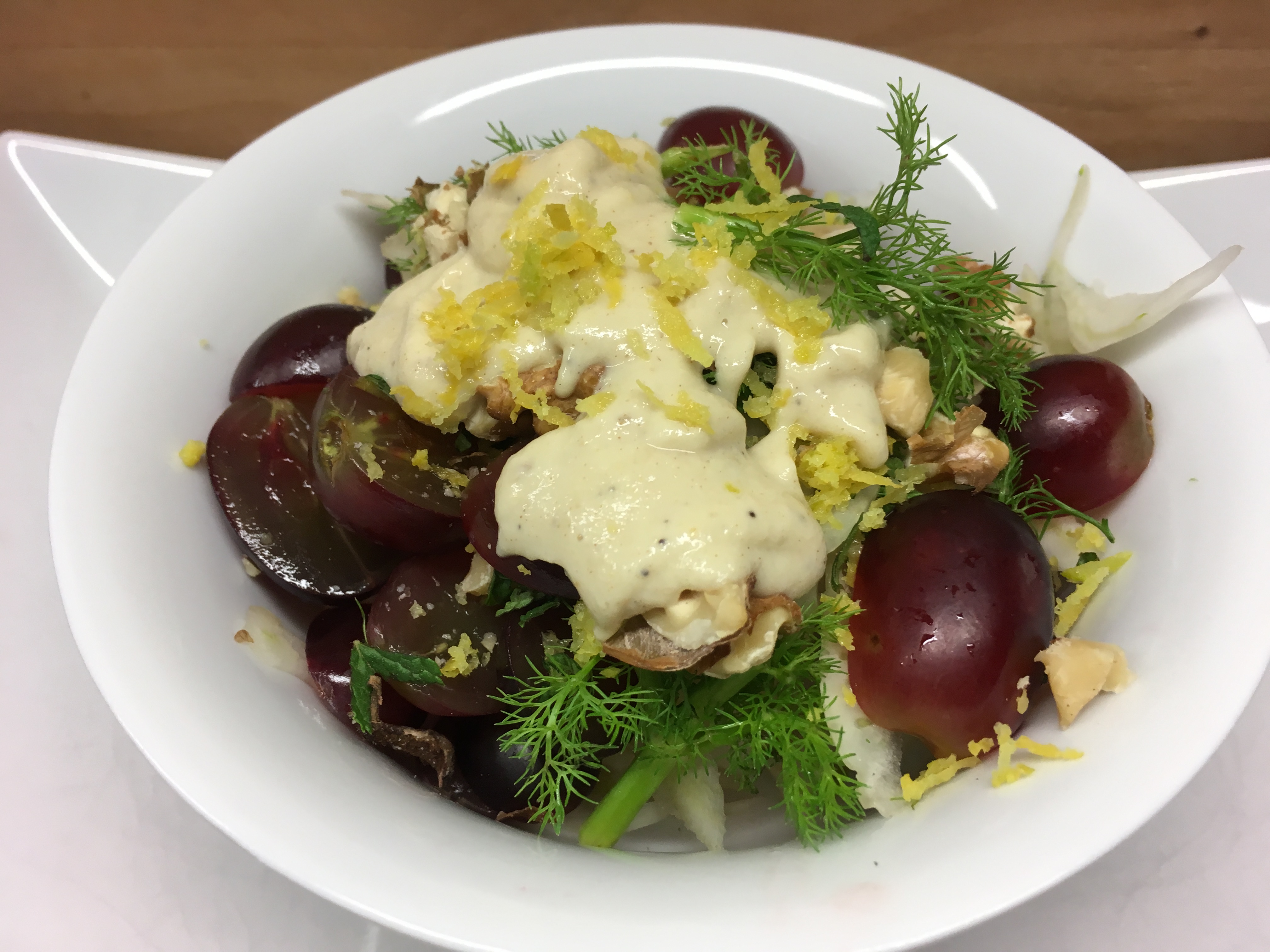 Das Rezept für den Fenchel Trauben Salat mit Walnüssen und Birnen-Miso-Tahini Dressing
