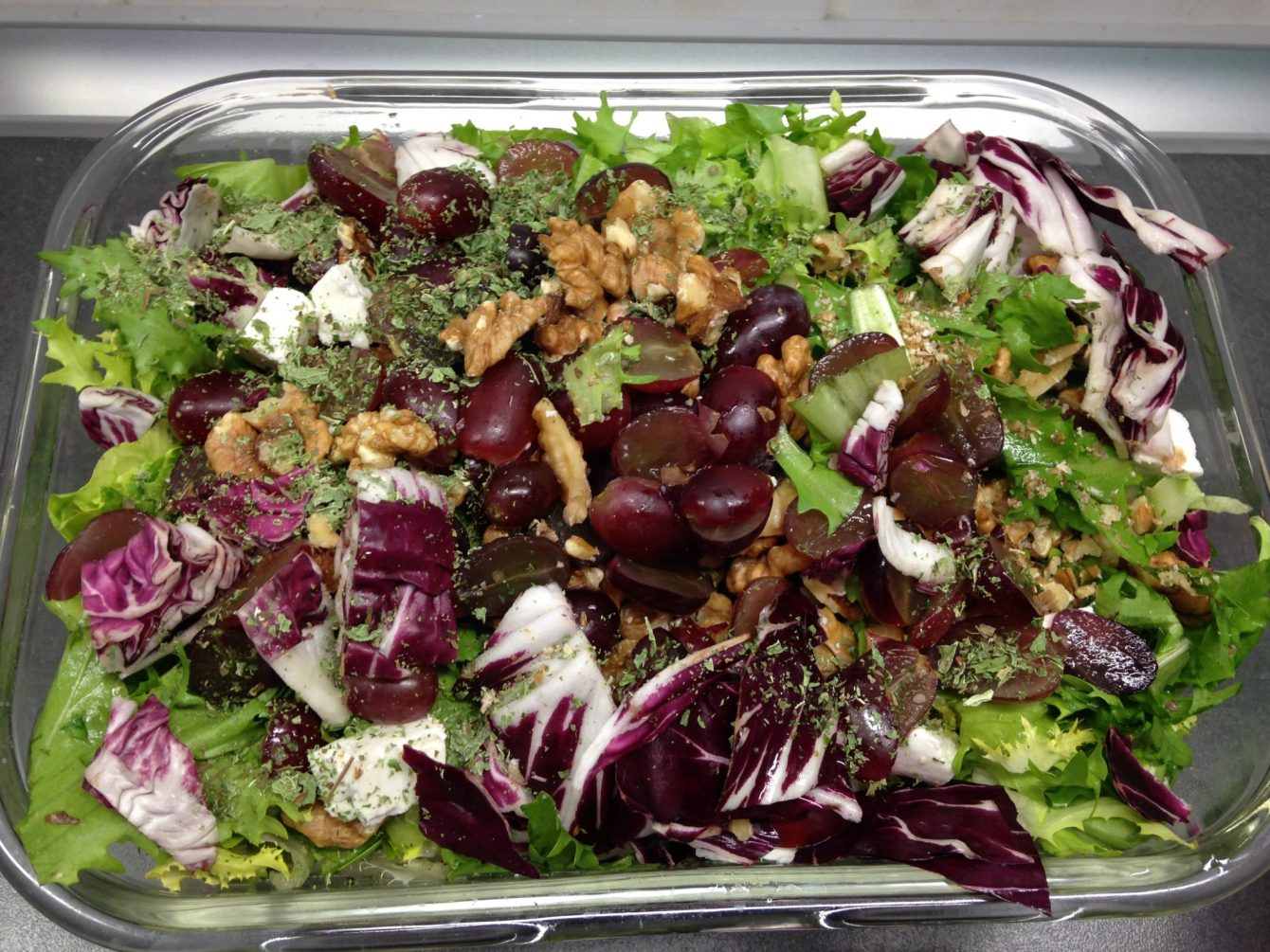 Frisee Salat mit Radicchio, Walnüssen, Trauben und Minze mit Haselnuss-Cranberry Vinaigrette