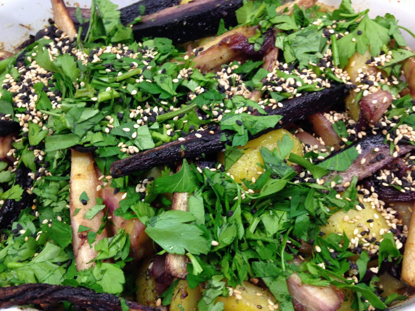 - Zum Schluß über das gebackene Gemüse geben und servieren. Mit ein paar frischen Kräutern und geröstetem Sesamsamen garnieren.