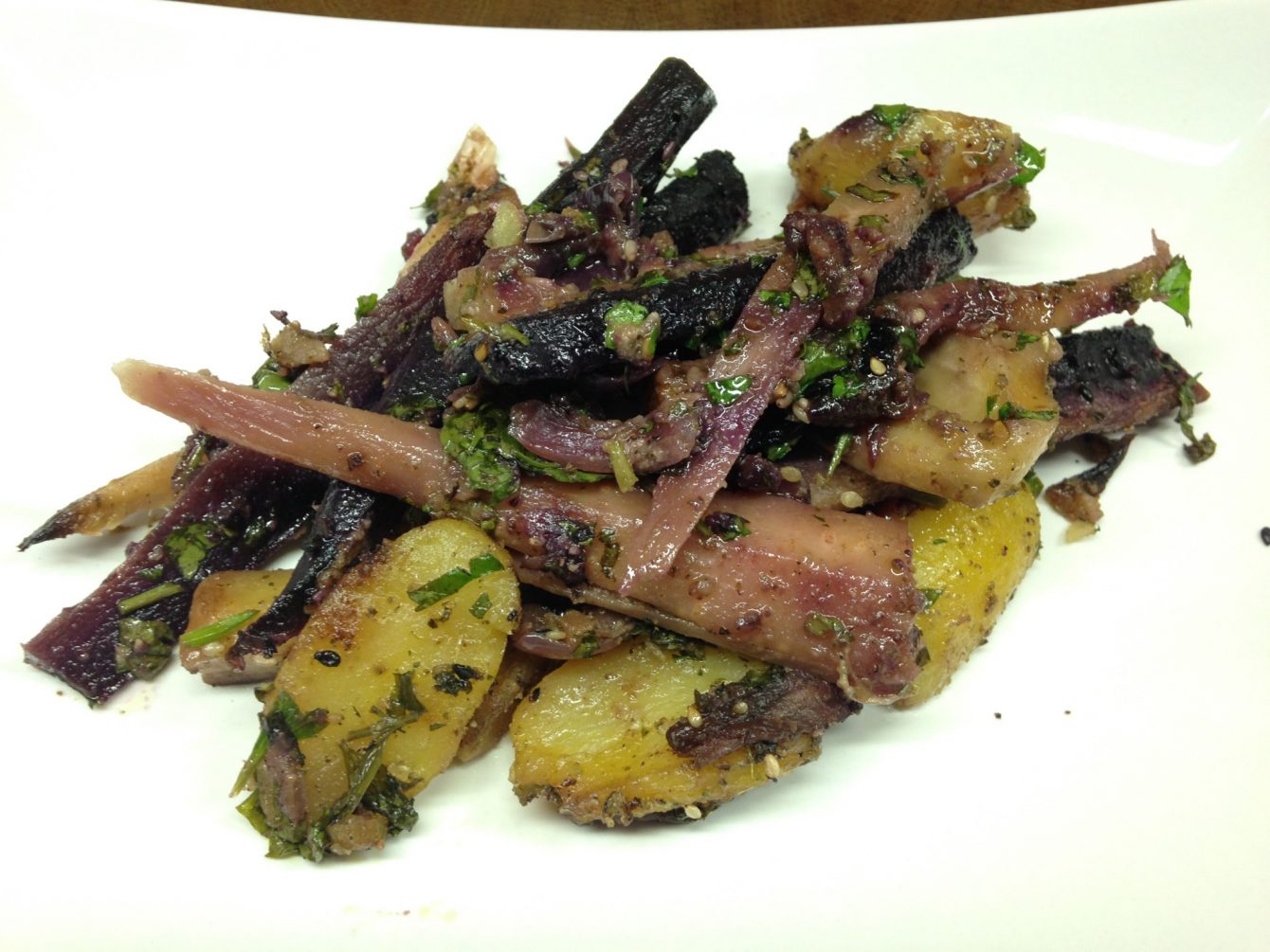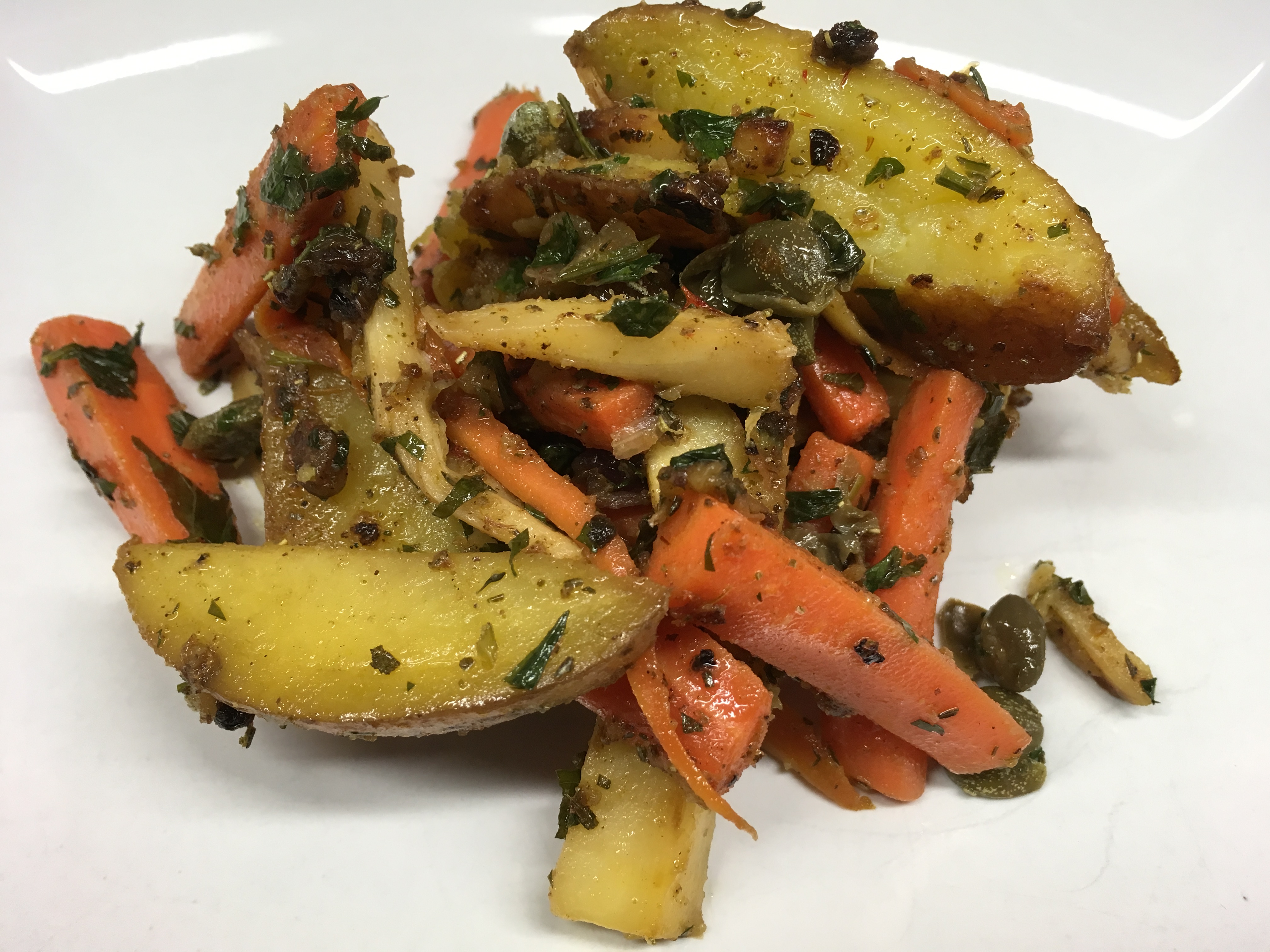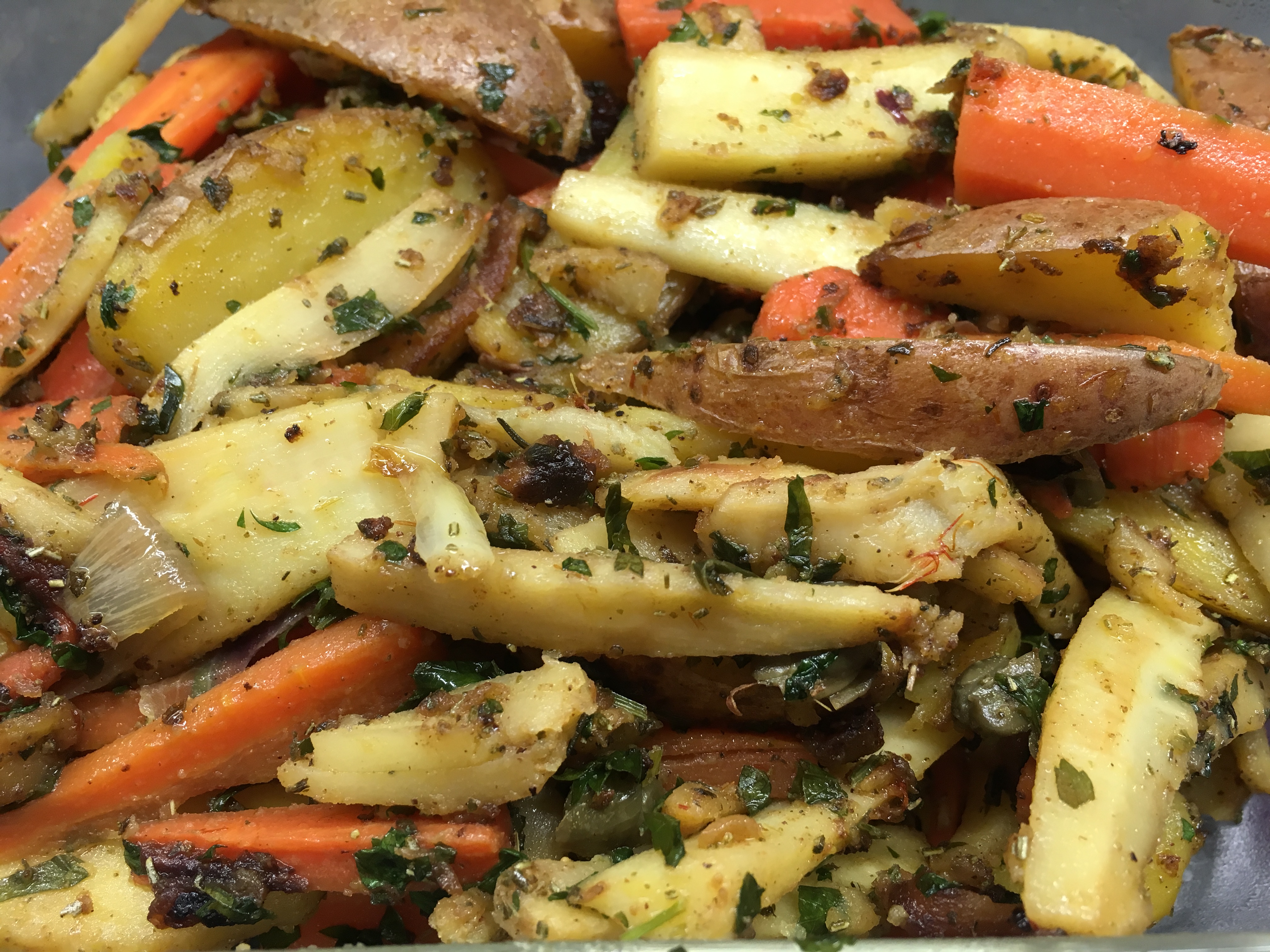 Der Clue dieses Gemüsegerichtes für die gebacken Pastinaken ist die Kapern Vinaigrette mit Senf und Ahornsirup, mit der das gebackene Gemüse erst ganz zum Schluss besprenkelt wird.