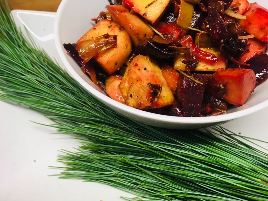 - Das Gemüse in eine Schüssel geben und mit dem Olivenöl, Kräutern, Salz und Pfeffer vermischen und in einer Auflaufform oder auf einem Backblech ausbreiten und ca. 50 Minuten rösten. Alternativ könnt ihr das Gemüse auch in einer großen Pfanne braten, dann geht es schneller.