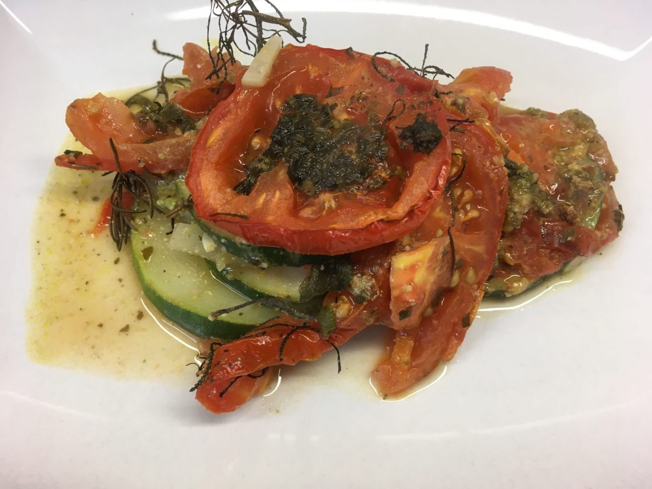 Zubereitung der gebackenen Zucchini und Tomaten mit Pesto und Olivenkraut