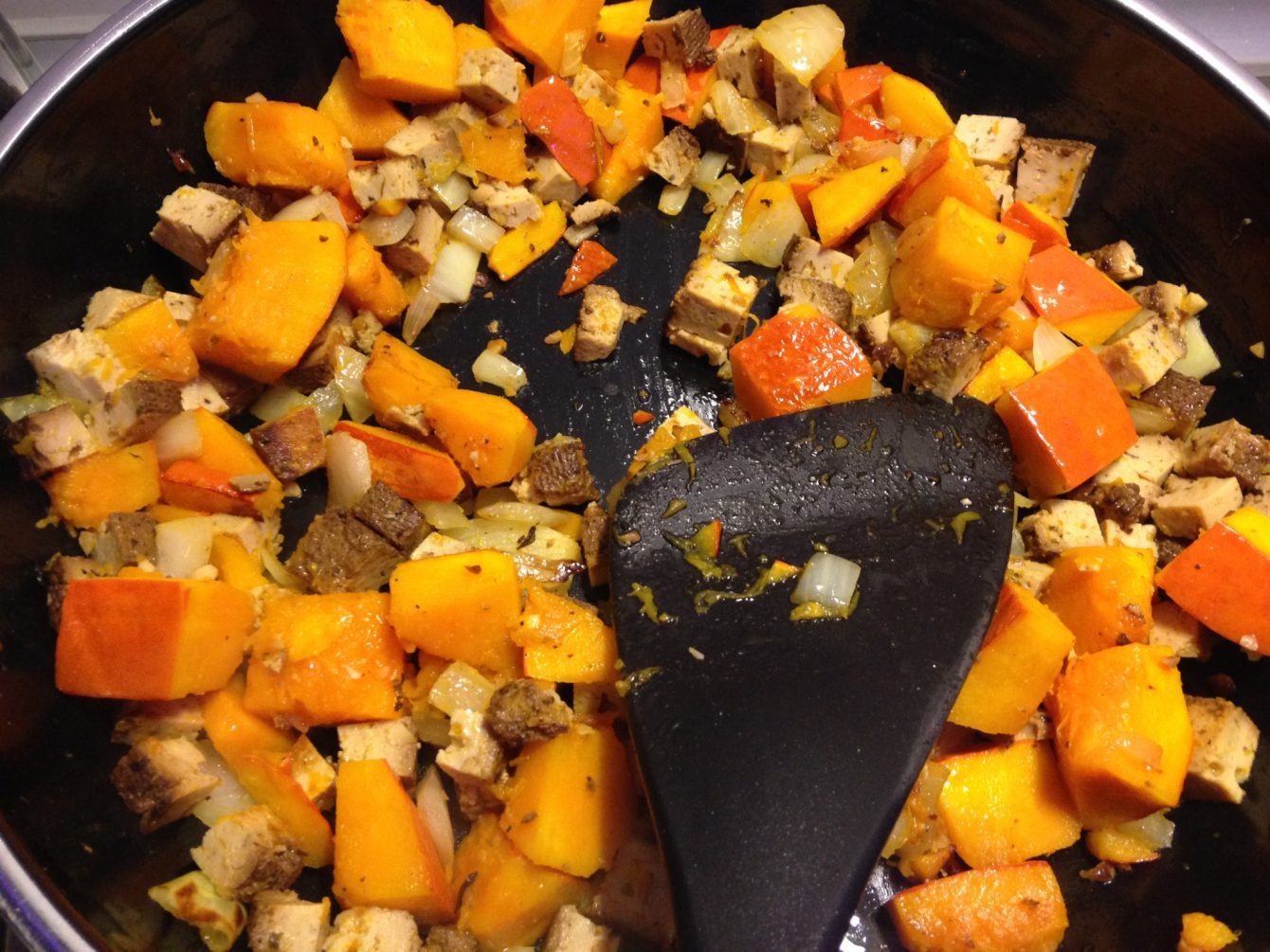 In einer Pfanne Sesamöl erhitzen, Zwiebeln Tofu und Kürbis braten, bis der Kürbis bißfest ist. Kurz vor dem Garpunkt, Banane dazu geben und einige Minuten mitbraten.