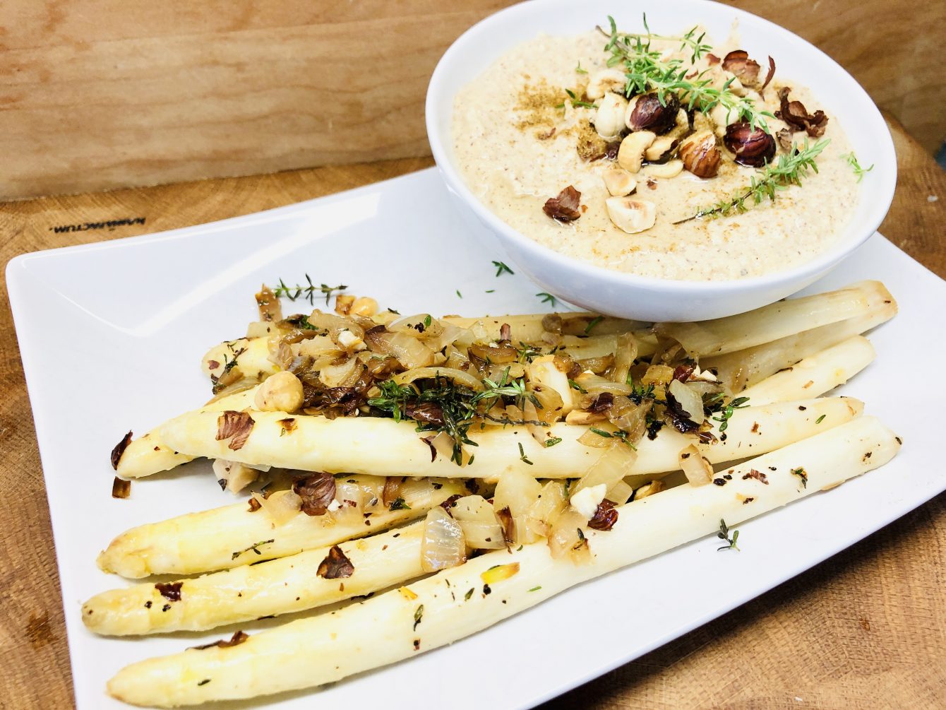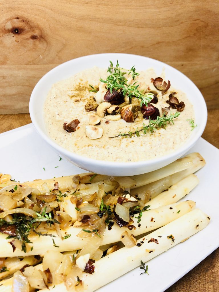 Das Rezept für den Haselnuss Chili Spargel mit Haselnuss Hummus