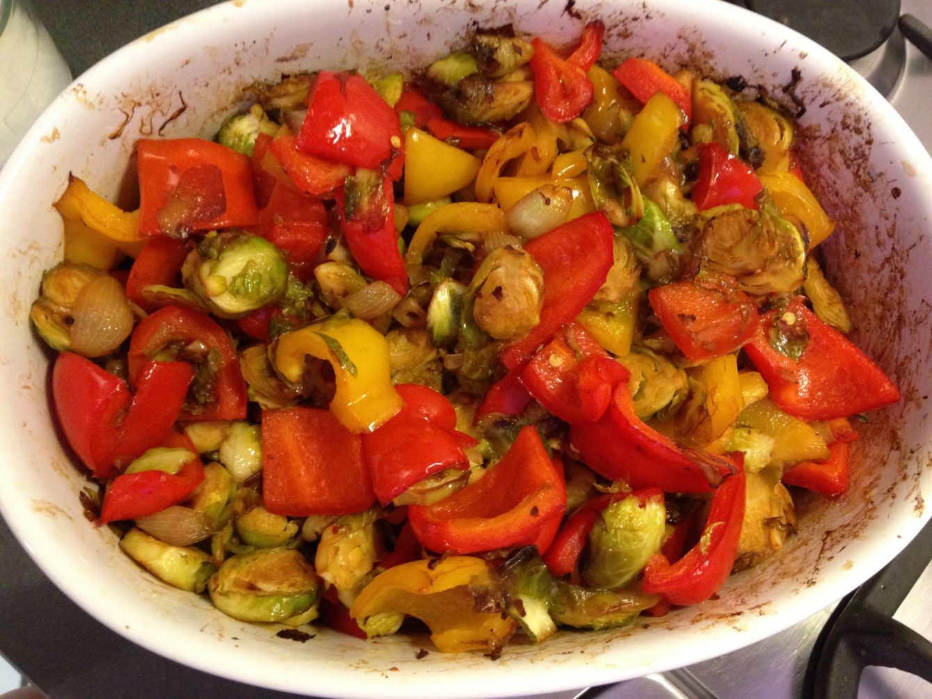 Gebratener Rosenkohl und Paprika mit Scharlotten und Ingwer in Chili Dressing
