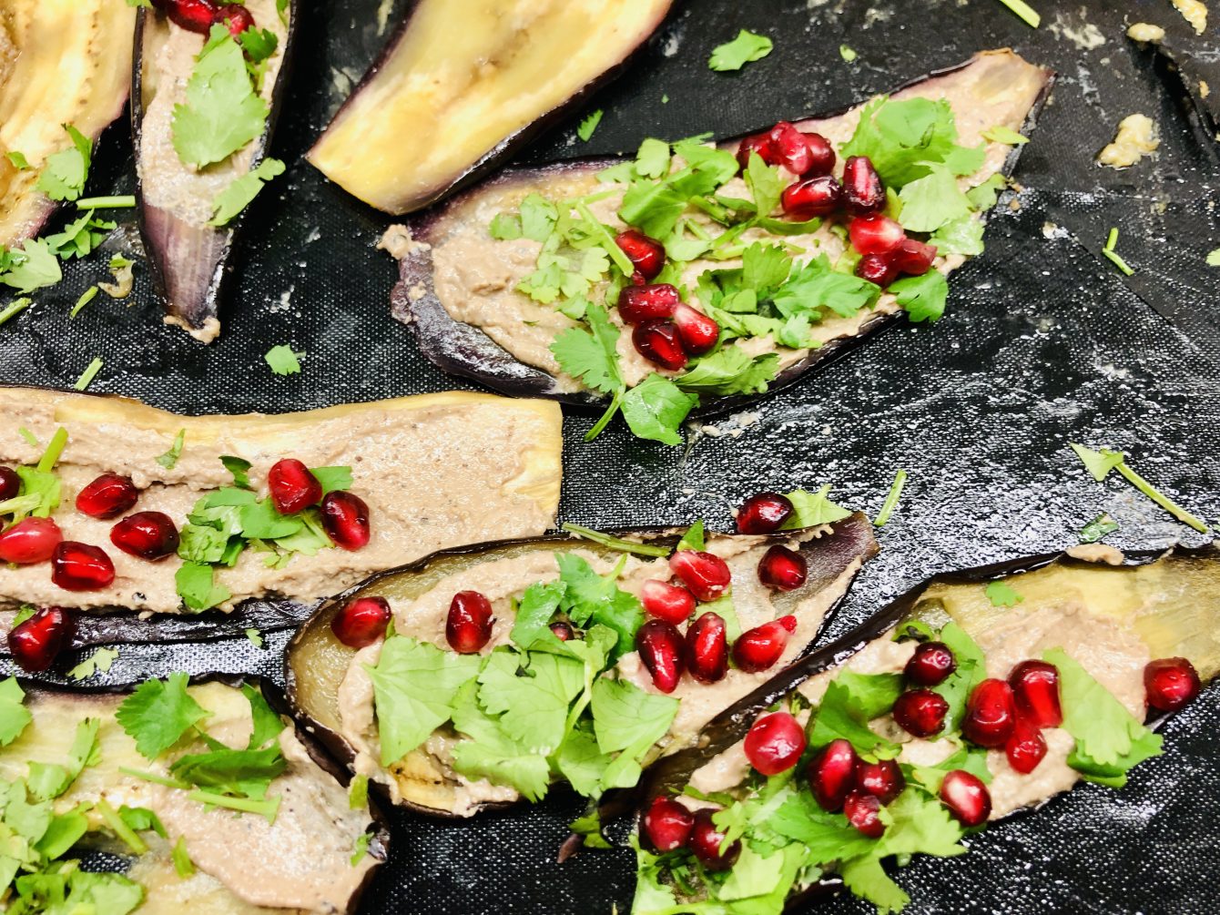 Die Auberginen werden in Scheiben geschnitten und in der Pfanne oder im Ofen geröstet. Sie werden anschließend mit der Walnuss Koriander Creme, frischem Koriander und Granatapfelkernen bestrichen und eingerollt.