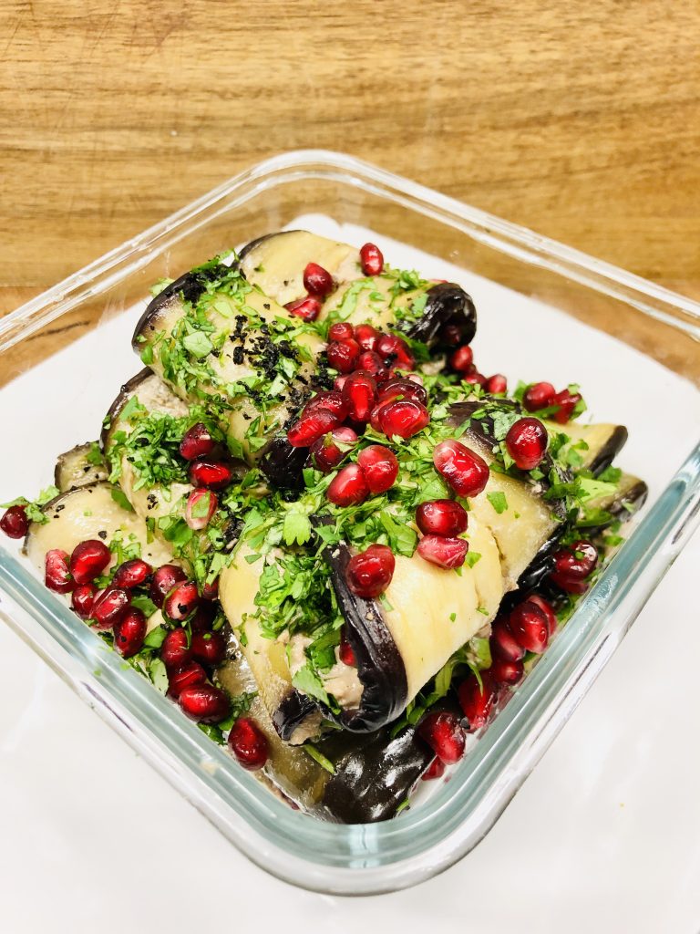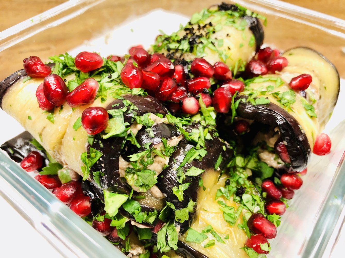 - Die Auberginenröllchen auf einem Teller mit etwas frischem Koriander, Granatapfelkernen und ein paar Spritzern Olivenöl garnieren.