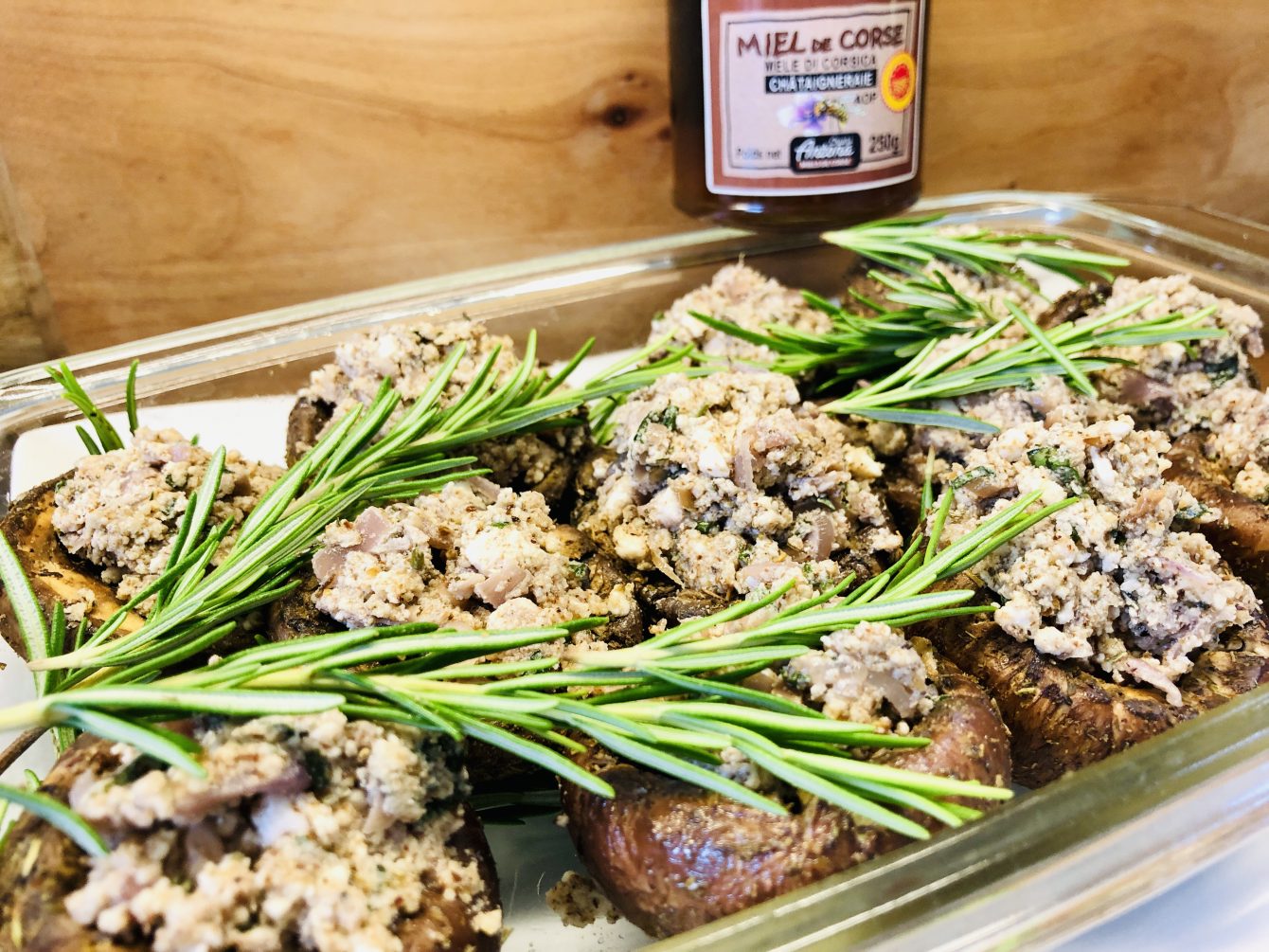 Meine Champignons mariniere ich mit Olivenöl, Zitronensaft und Korsischen Kräutern. Dann fülle ich sie mit Walnussmus und Ziegenkäse (Feta) und überbacke sie im Ofen.