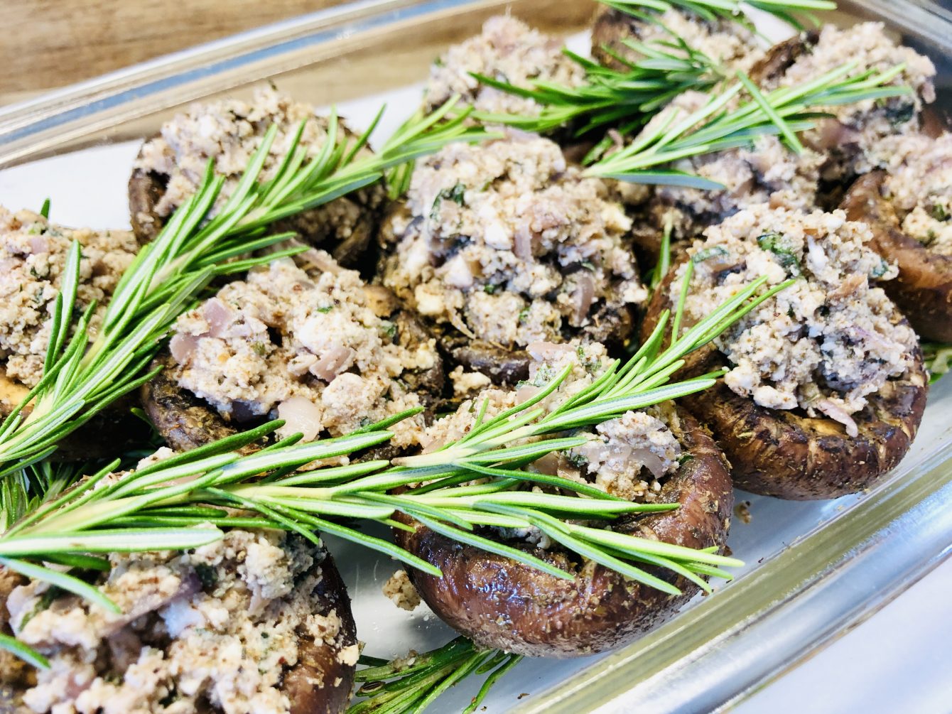 6. Die marinierten Champignons mit den Walnussmus und dem Ziegenkäse füllen und zusammen mit den Rosmarinzweigen in eine feuerfeste Form geben.