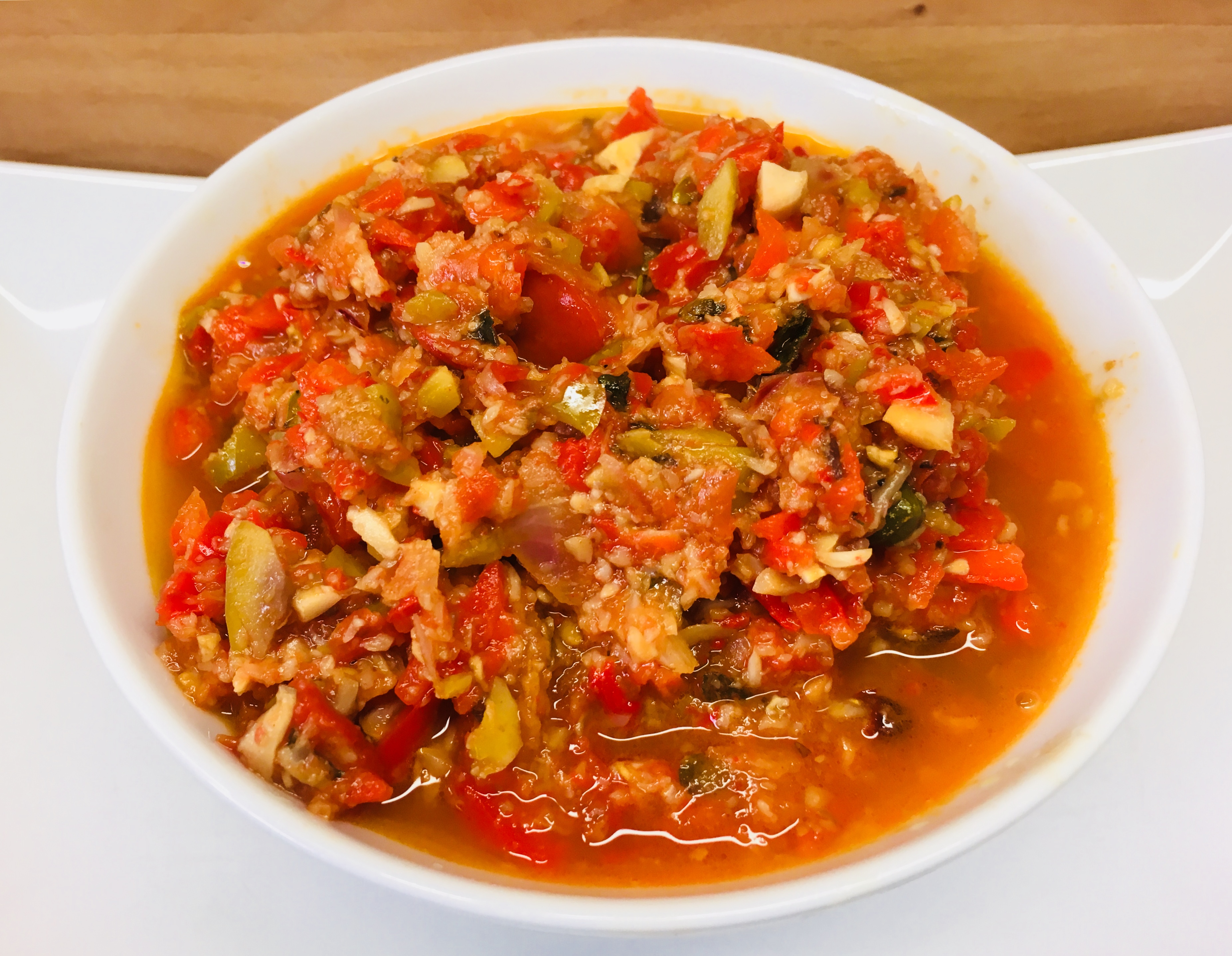 Meine Dattel Chili Caponata wird aus den Portobello Stielen, Zwiebeln, Knoblauch, Paprika und Tomaten mit Oliven, Kapern, Chili und Datteln zubereitet. Das Gemüse wird fein gewürfelt und gedünstet und mit Balsamico Essig abgelöscht. Statt karamellisiertem Zucker süßen in meinem Rezept die Datteln und die sind schon süß genug.