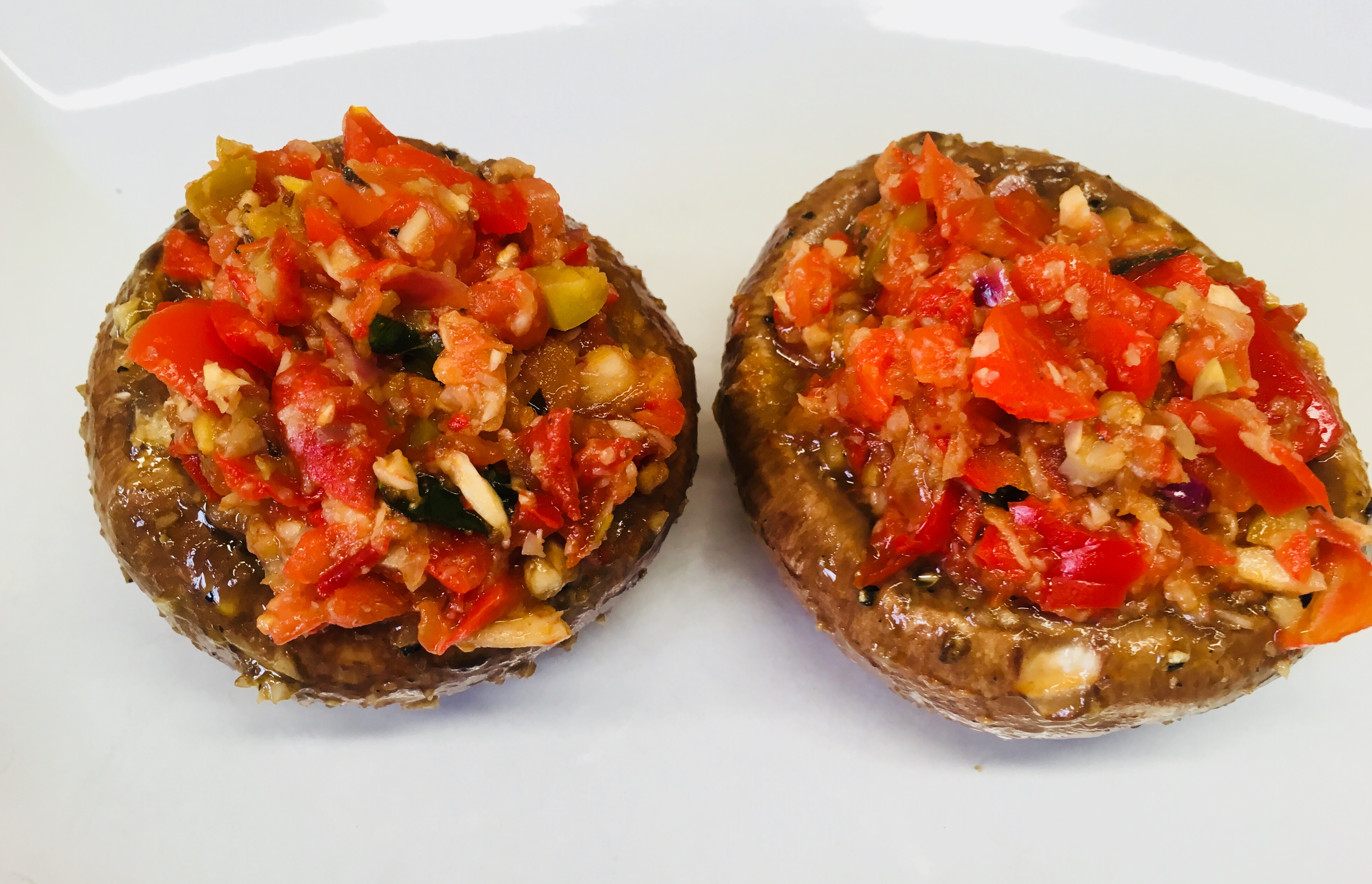 Gefüllte Knoblauch-Balsamico Portobello Pilze mit Dattel Chili Caponata sind das perfekte Gemüsegericht für den Sommer.