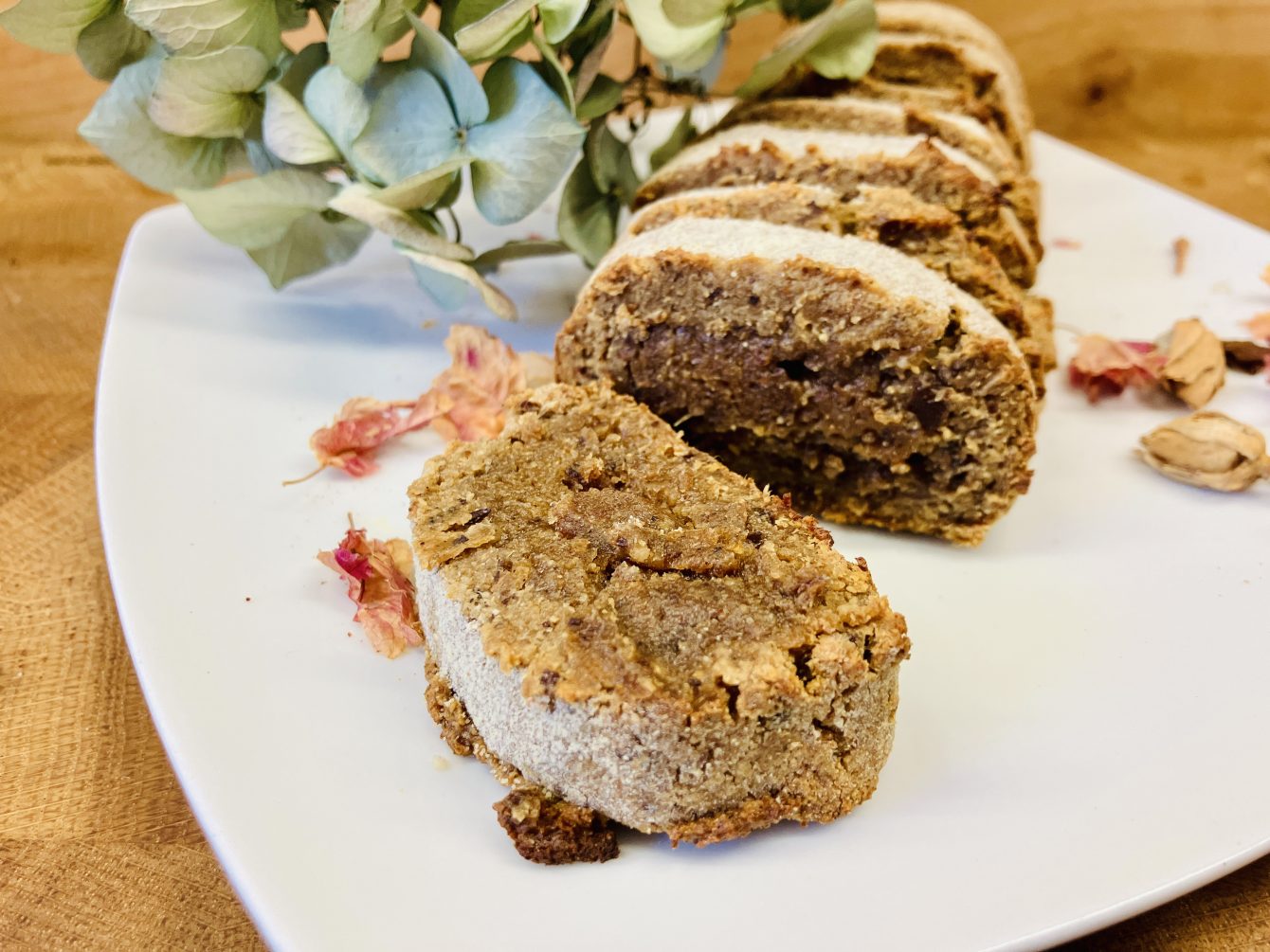Diese gefüllte Mandel-Mohn-Rolle besteht aus einem Mandelmehl-Teig und einer cremigen Dattel-Mohn Füllung.