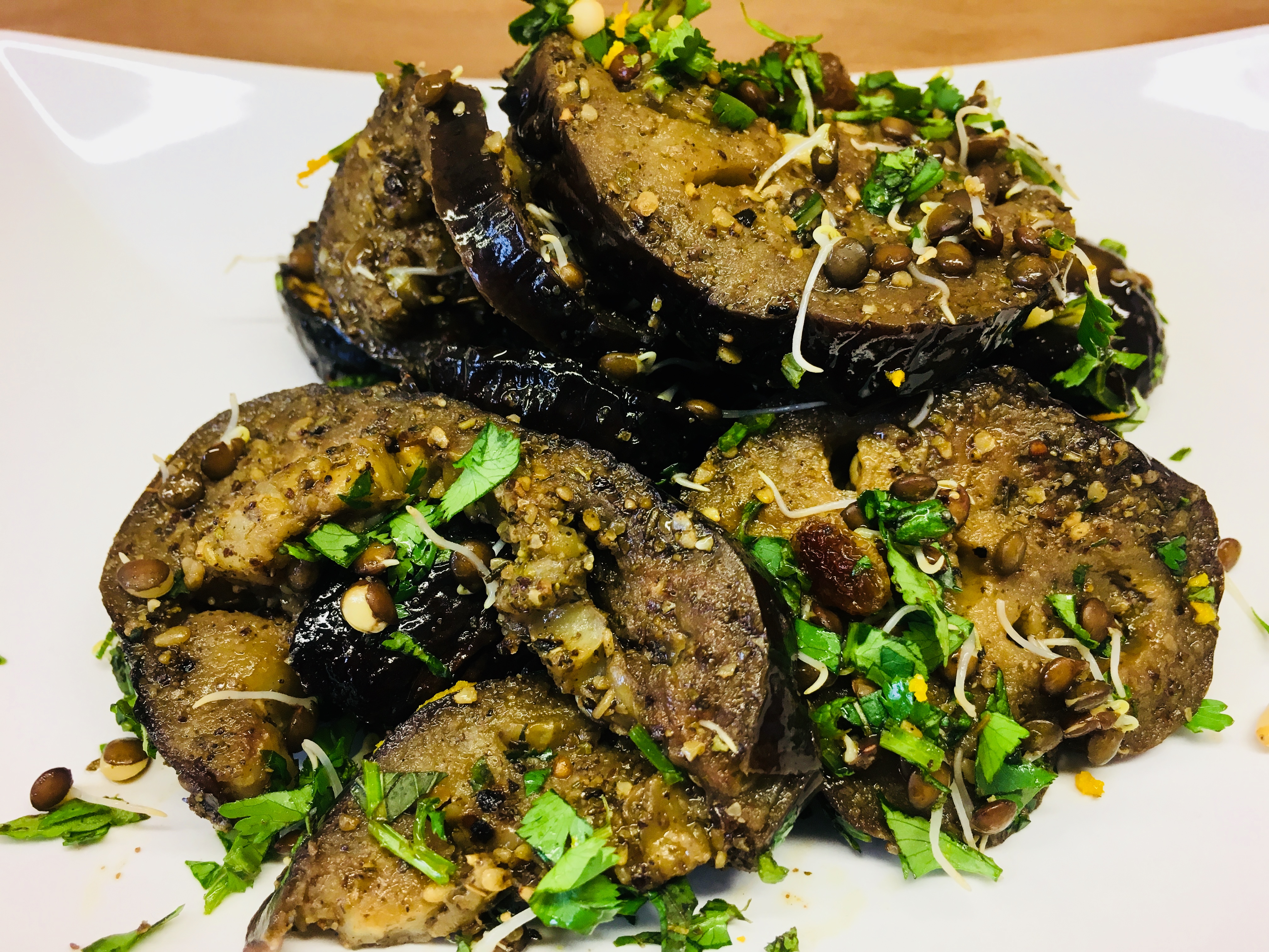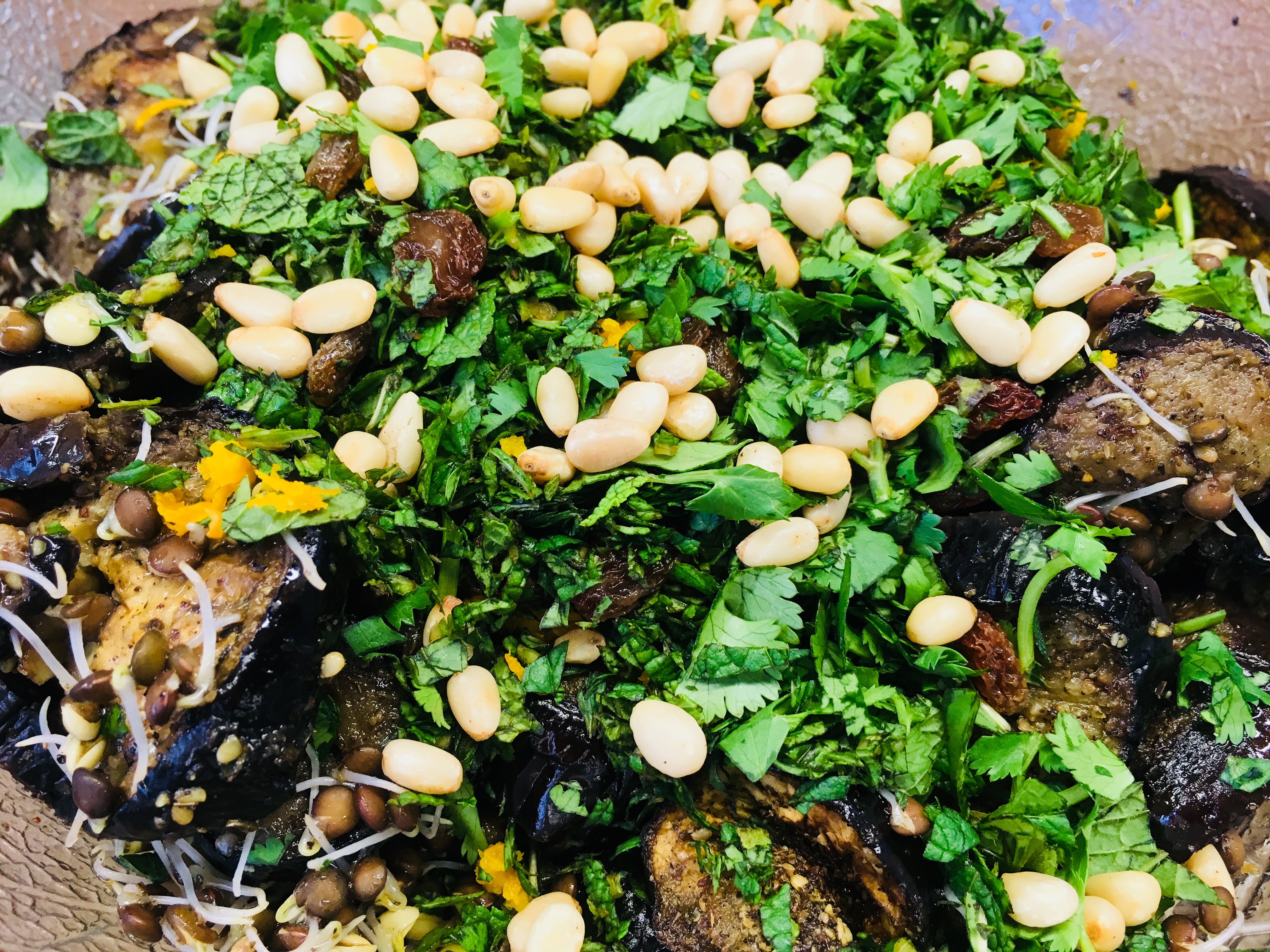- Wenn die Auberginen gar sind, in einer Salatschüssel mit den Linsensprossen, den Rosinen, Pinienkernen und dem Dressing vermischen. Mit frischen Kräutern und Zitronenzesten garniert servieren und genießen.