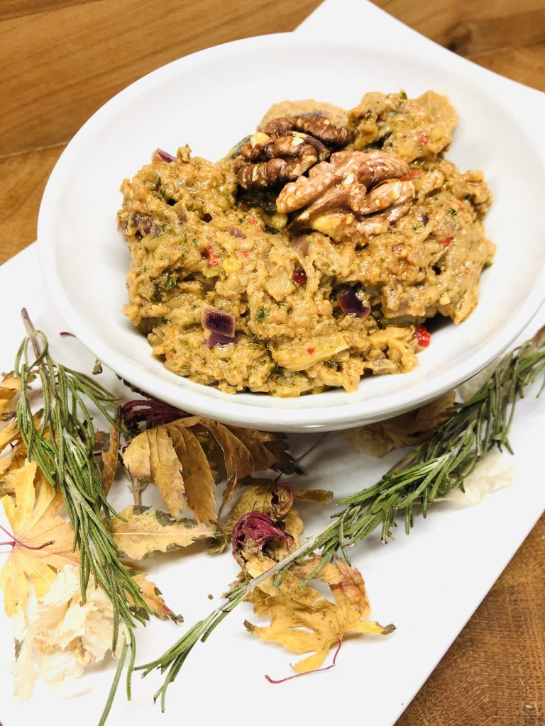 Das Rezept für die geröstete Auberginen und Paprika mit Walnuss Tahini Sauce